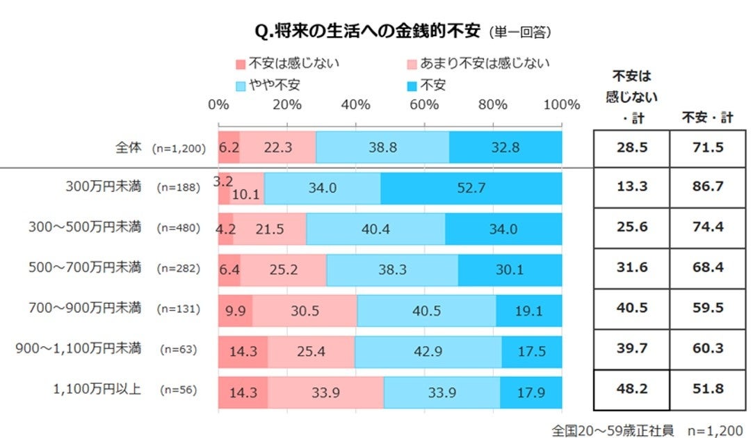 - 正社員の6割が今の生活に金銭的不満を抱き、将来への不安を抱えている人は7割に。4人に1人が食費、3人に1人が交際費、趣味費の出費をためらう【図6、7、8】
