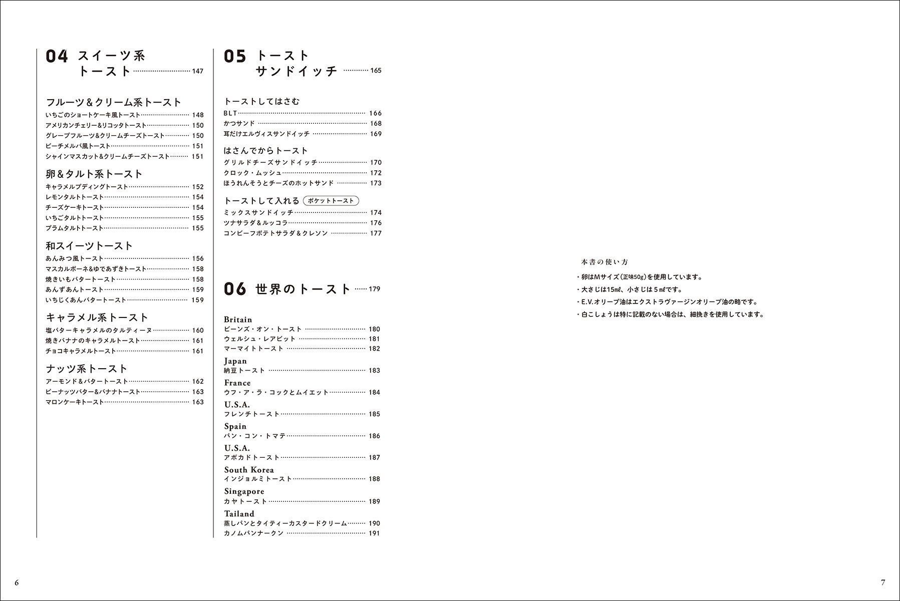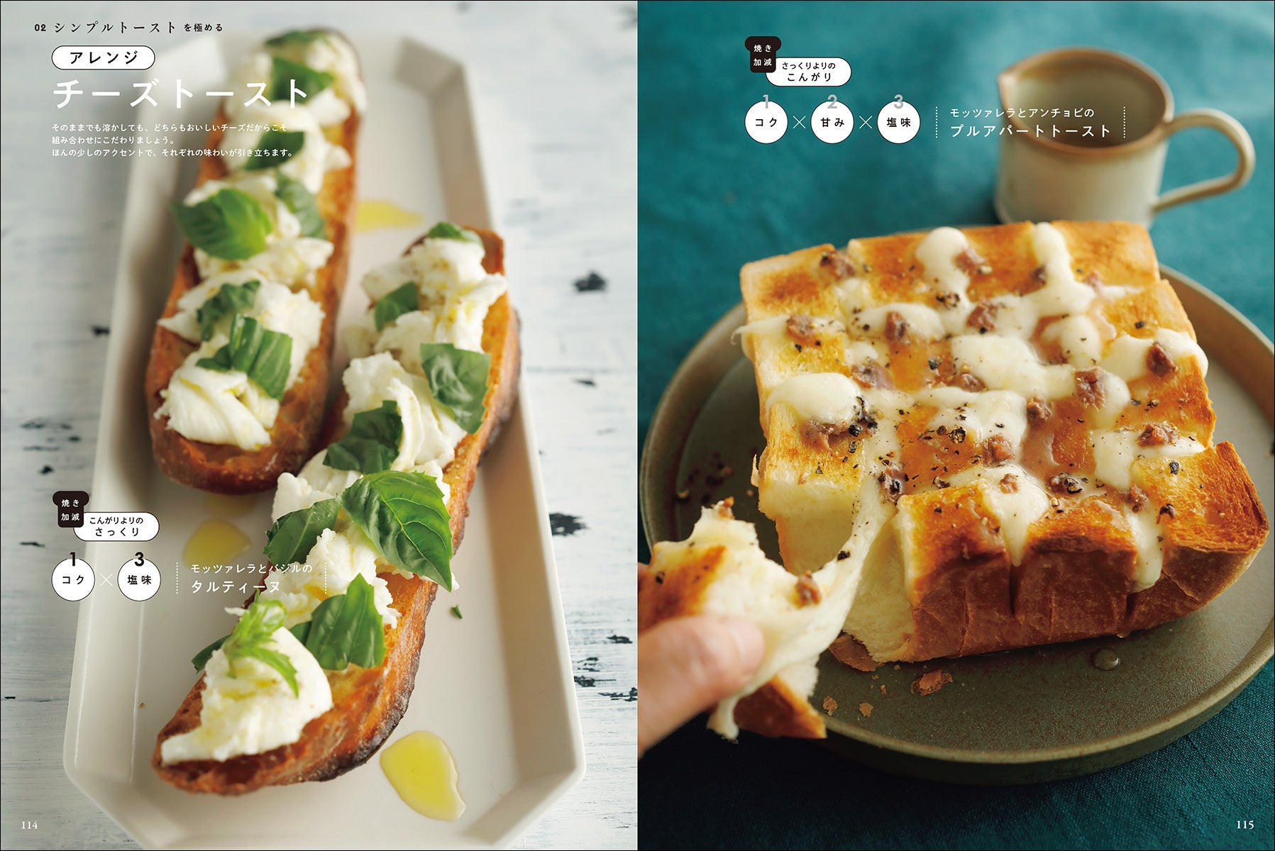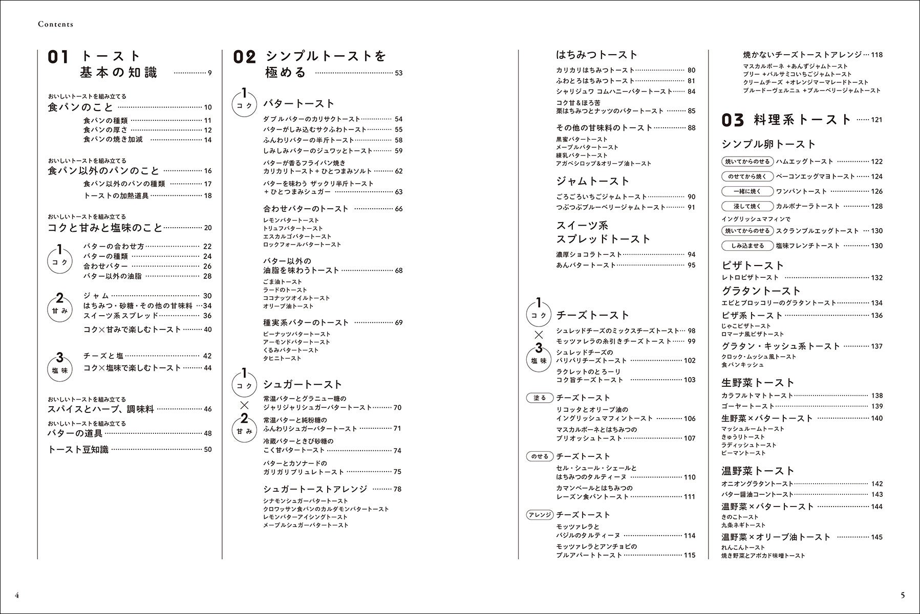 ・料理系トーストでは、シンプル卵系トースト、ピザ・グラタントースト、生野菜・温野菜などに分類。またスイーツ系トーストでは、フルーツ&クリームチーズ系、卵&タルトト系、和スイーツ、キャラメル系、ナッツ系などのアレンジレシピが盛りだくさん紹介されています。