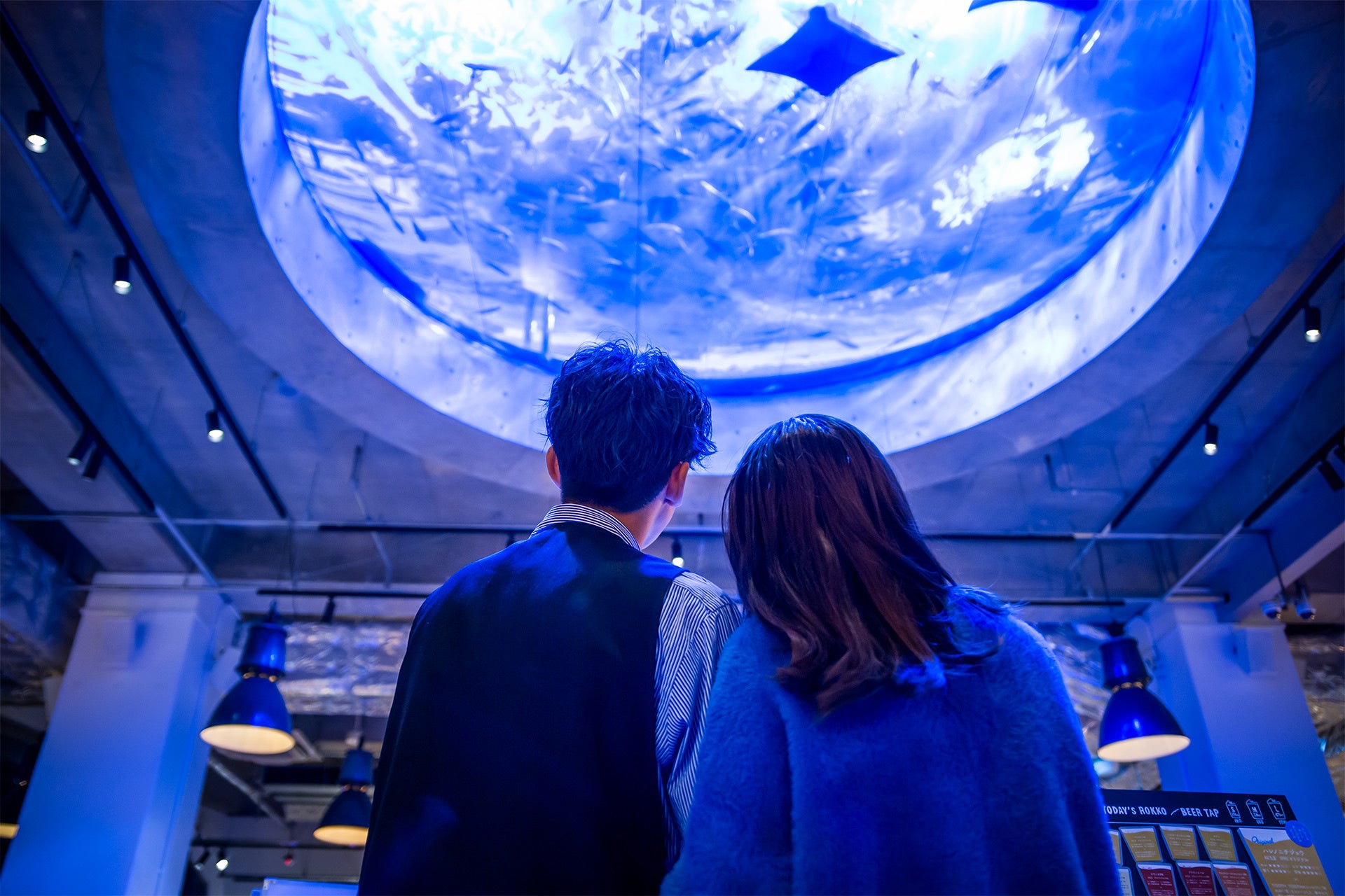 トゥースマートフードホールのシンボルである、中央バーカウンターの上にある幻想的な巨大水槽のブルーを中心に、ブルーキャンドルナイトや青いカクテルを愉しむブルーBarで、フードホール内をブルーに彩ります。