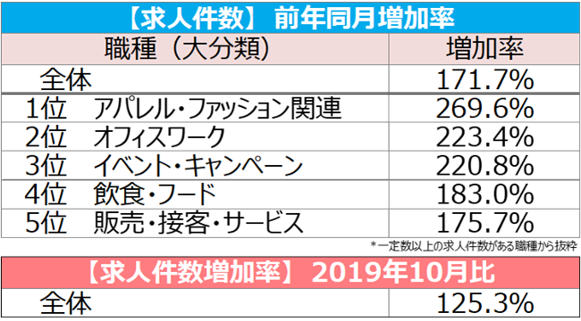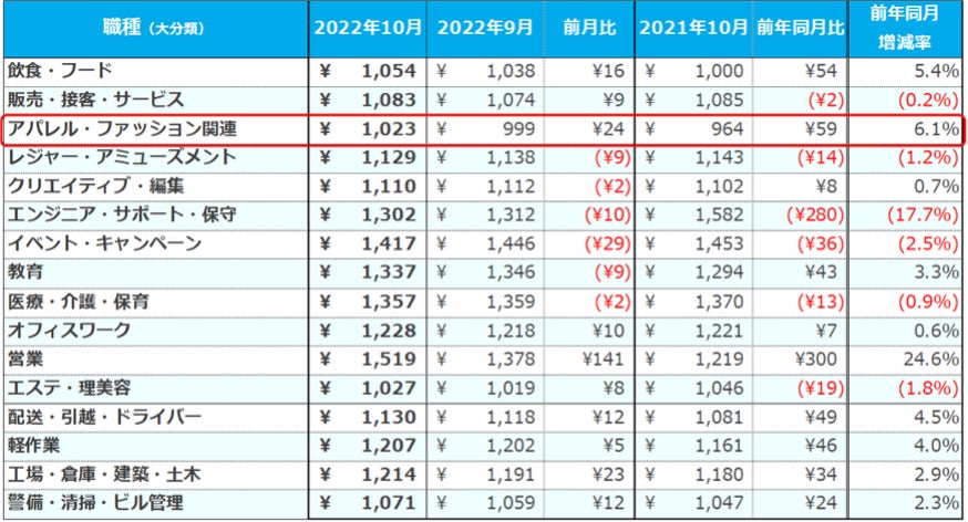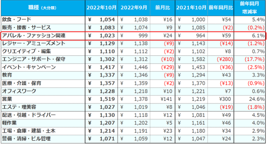 職種(大分類)別では、2020年1月の調査開始以来はじめて全16職種で平均1,000円を超えた。特に[アパレル・ファッション関連]では1,023円(前月比:+24円、前年同月比:+59円)となり、過去最高額を更新。求人件数は前年同月比で2.7倍に増加した。