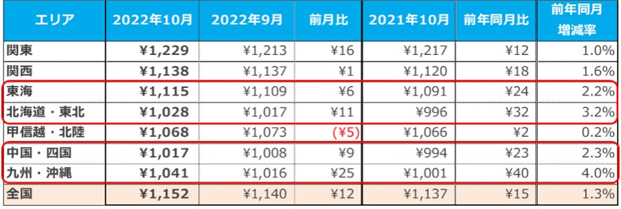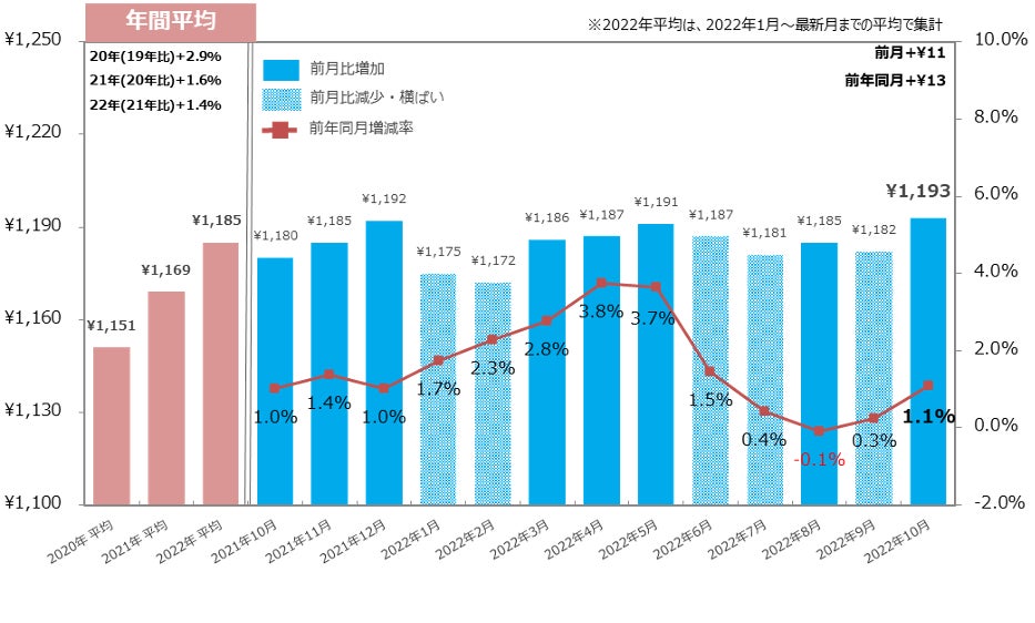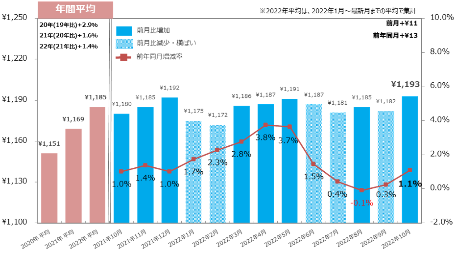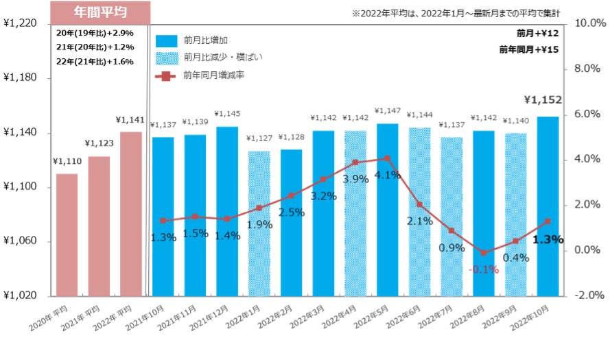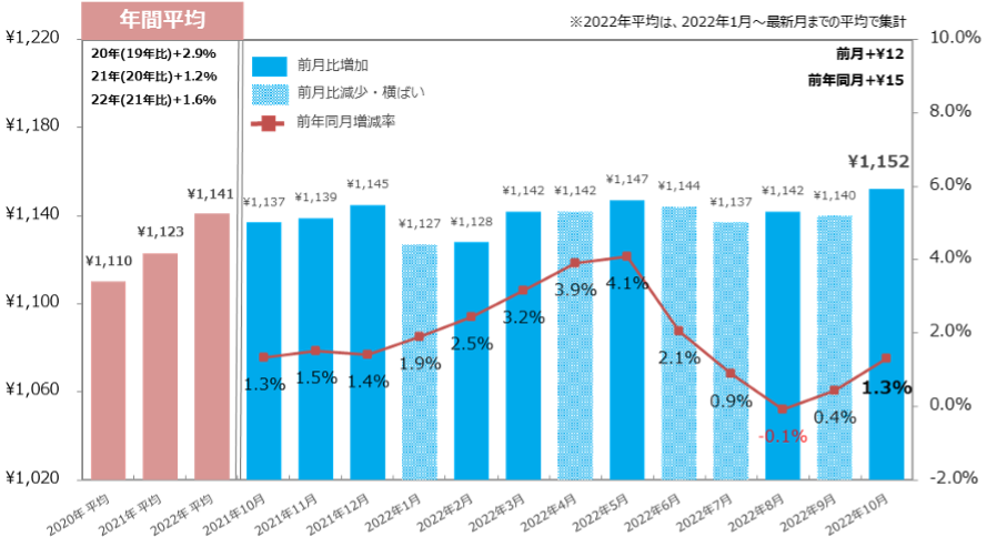 22年10月の全国平均時給は1,152円(前月比:+12円、前年同月比:+15円)で、前月比・前年同月比ともに増加し過去最高額を更新した。【図1】