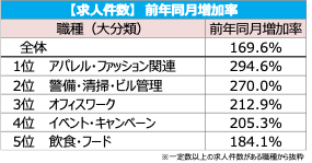 職種(大分類)別でみると[アパレル・ファッション関連]が1,058円となり、前月比で25円の増加、前年同月比で61円の増加(増減率:+6.1%)で過去最高額を更新。求人件数では、前年同月比で2.9倍に増加した。その他、全16職種の平均時給は、前月比・前年同月比ともに9職種が増加、7職種が減少となった。【図6、7】