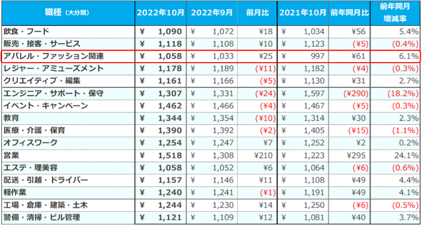 - 三大都市圏の平均時給は1,193円で過去最高額を更新。[アパレル・ファッション関連]の平均時給は1,058円(前年同月比:+61円)で過去最高に