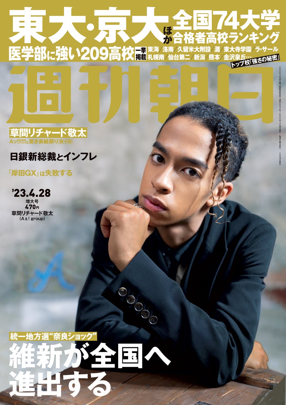 関西ジャニーズJr.の星、Aぇ! groupのメンバー6人が一人ずつ表紙を飾るスペシャル企画「Aッ!!!!!!と驚き表紙祭り」。第4弾は多彩な人材がそろうジャニーズでもとびっきりの存在感を放つ草間リチャード敬太さんです。ほかにも、統一地方選で強さをみせる維新のゆくえ、日銀総裁交代で政策転換はあるか、大学合格ランキング・国公立大医学部編、週刊朝日の人気連載が与えたインパクトを検証する企画など、バラエティー豊かなラインナップでお届けします。