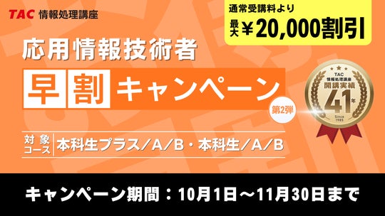 情報処理技術者試験対策講座を展開しているTAC株式会社(東京都千代田区、代表取締役:多田敏男)は、応用情報技術者の受講料がお得になる「早割キャンペーン第2弾」が11月30日(日)で終了いたします。