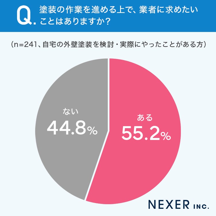 55.2%の方が塗装の作業を進める上で、業者に求めたいことが「ある」と回答しています。