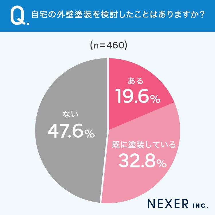 ということで今回はカノウ株式会社と共同で、事前調査で「一戸建ての持ち家に住んでいる」と回答した全国の男女460名を対象に、「外壁塗装の検討」についてのアンケートをおこないました。