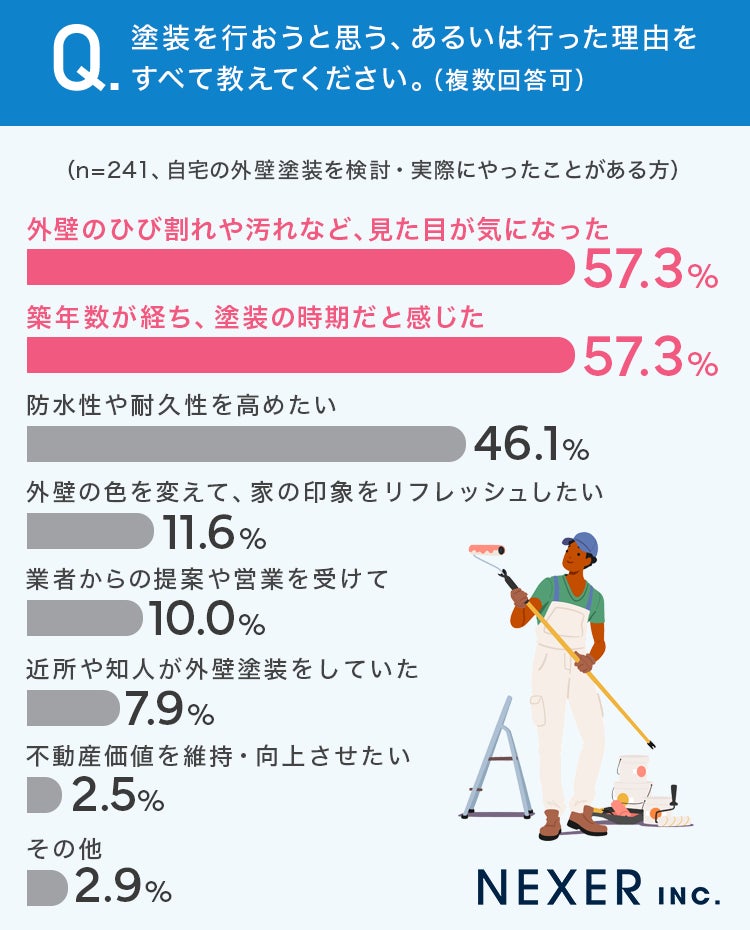 57.3%と半数以上の方が選んでいたのが「外壁のひび割れや汚れなど、見た目が気になってきたから」と「築年数が経ち、塗装の時期だと感じているから」でした。