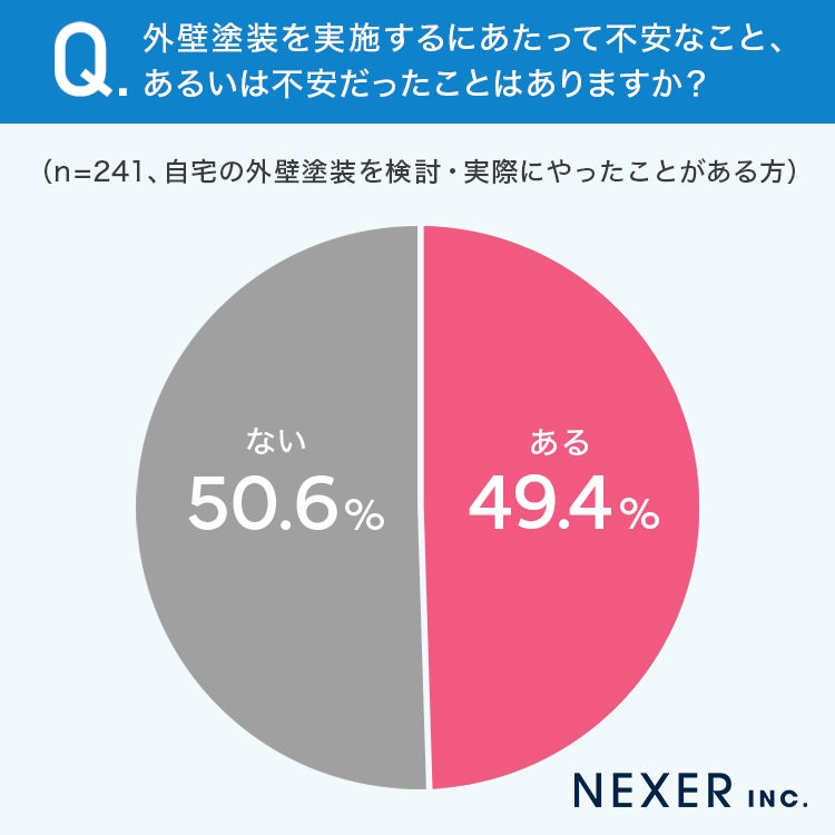 49.4%とほぼ半数の方が外壁塗装を実施するにあたって不安なこと、あるいは不安だったことが「ある」と回答しています。