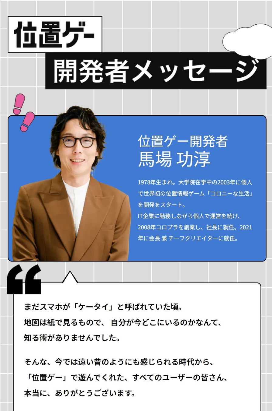 周年サイト内では、弊社創業者にして「位置ゲー」開発者である馬場功淳からのコメントも掲載。開発当時の想いから、今年開発から22年という時を経ても世界で愛され続けることへの感謝の気持ちをコメントしています。