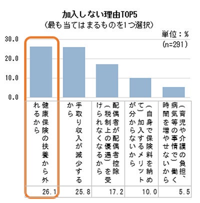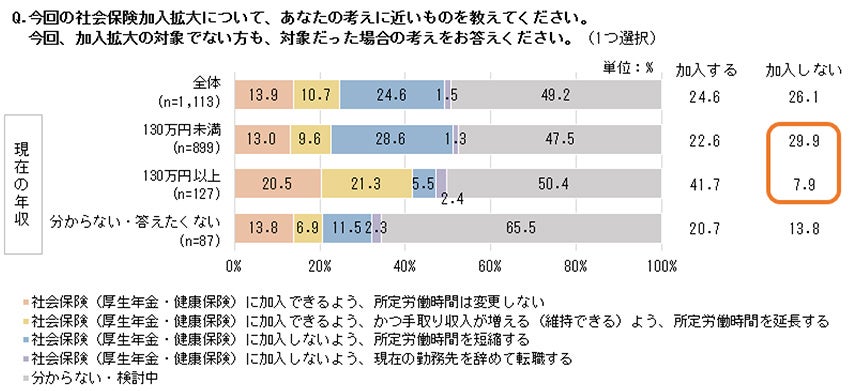 社会保険への加入意向を聞くと、全体のうち、半数程度は「分からない・検討中」ではあるものの、残り半数は「加入する」24.6%と「加入しない」26.1%が同程度でした。現在の年収別に見ると、130万円以上では「加入しない」が1割未満であるのに対し、130万円未満では約3割と差がありました。これは、社会保険の扶養の基準となる「年収130万円未満」、いわゆる「130万円の壁」を意識していることがうかがえます。実際、加入しない理由で一番多かったものは、「健康保険の扶養から外れるから」26.1%でした。