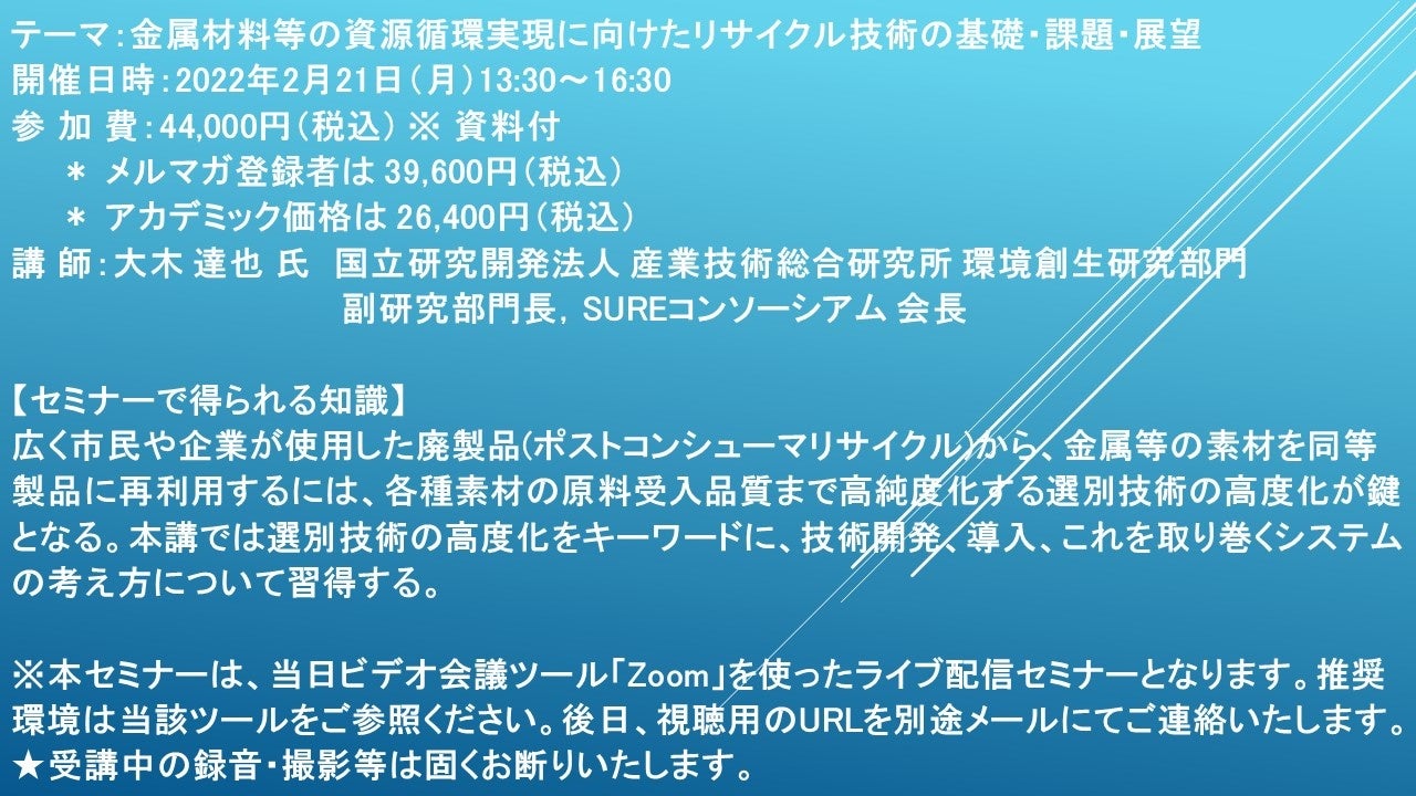 【ライブ配信セミナー】金属材料等の資源循環実現に向けたリサイクル技術の基礎・課題・展望 2月21日(月)開催 主催:(株)シーエムシー・リサーチ