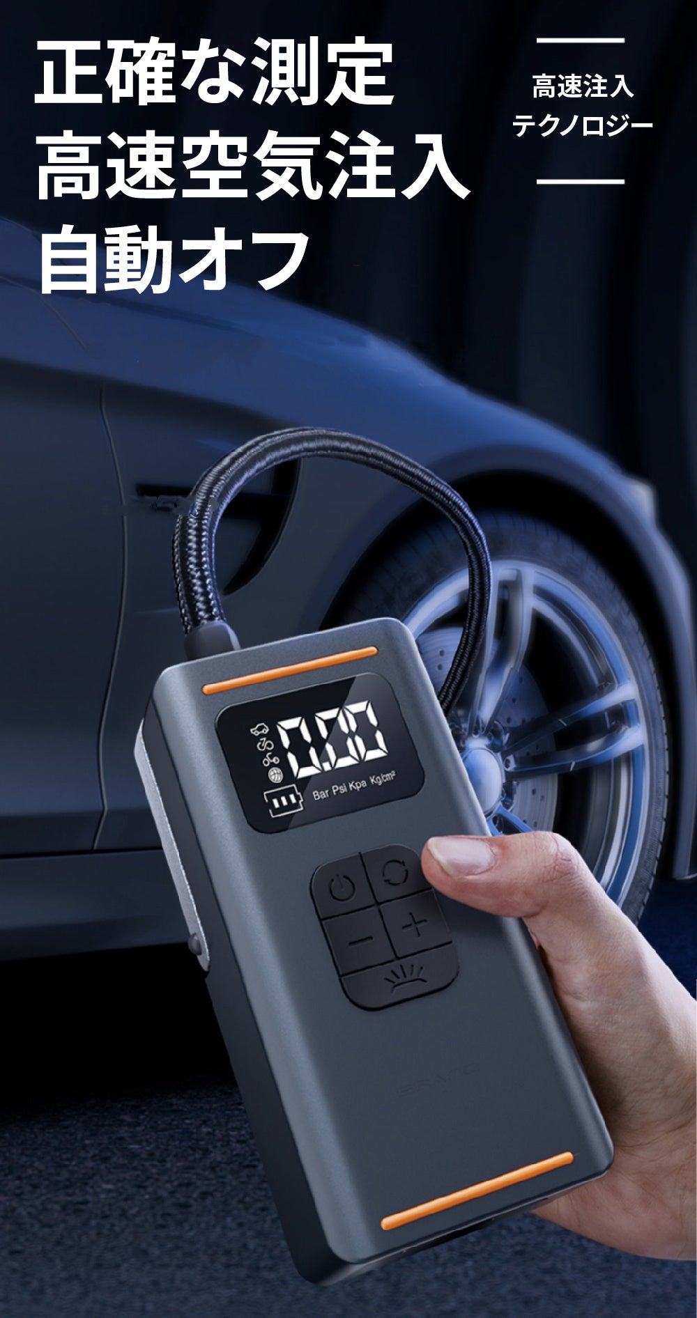Gamp-Jetはリチウムイオンバッテリーを使用しており、電源の持続時間が長いです。6000mAhの大容量バッテリーなので、満タンに充電した後であれば、最大4台の車のタイヤに空気を入れることができます。