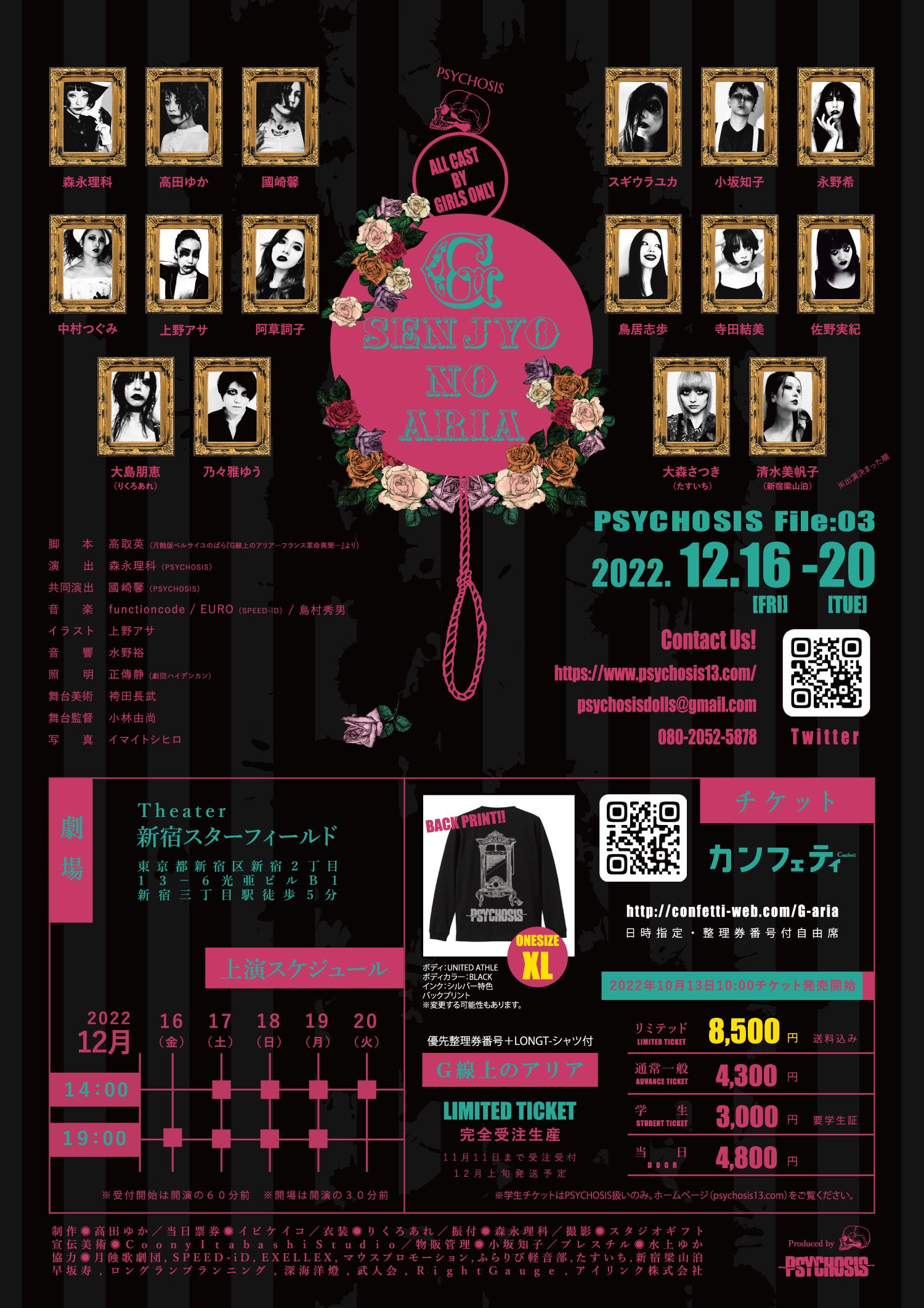 PSYCHOSIS『G線上のアリア』が2022年12月16日 (金) ~ 12月20日(火)にTheater新宿スターフィールド(東京都新宿区)にて上演されます。チケットはカンフェティ(運営:ロングランプランニング株式会社、東京都新宿区、代表取締役:榑松 ⼤剛)にて発売中です。