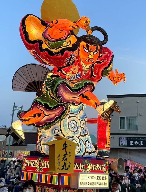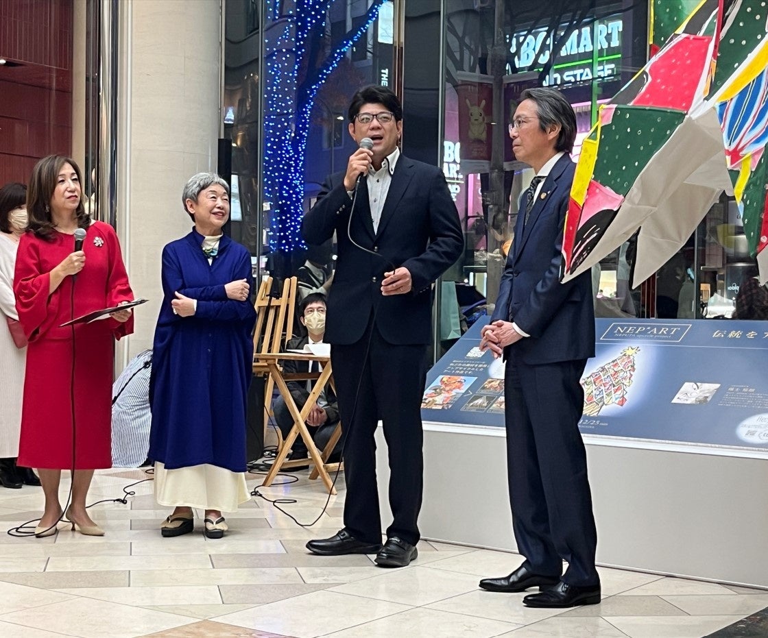 点灯式では、ツリーに使用したねぷたの写真をご覧いただきながら、今回の取り組みの背景や、アップサイクルの取り組み、伝統の継承についてのお話を一般社団法人 サーキュラーコットンファクトリー 代表の渡邊智惠子様、立佞武多制作者の福士裕朗様にお話しいただきました。