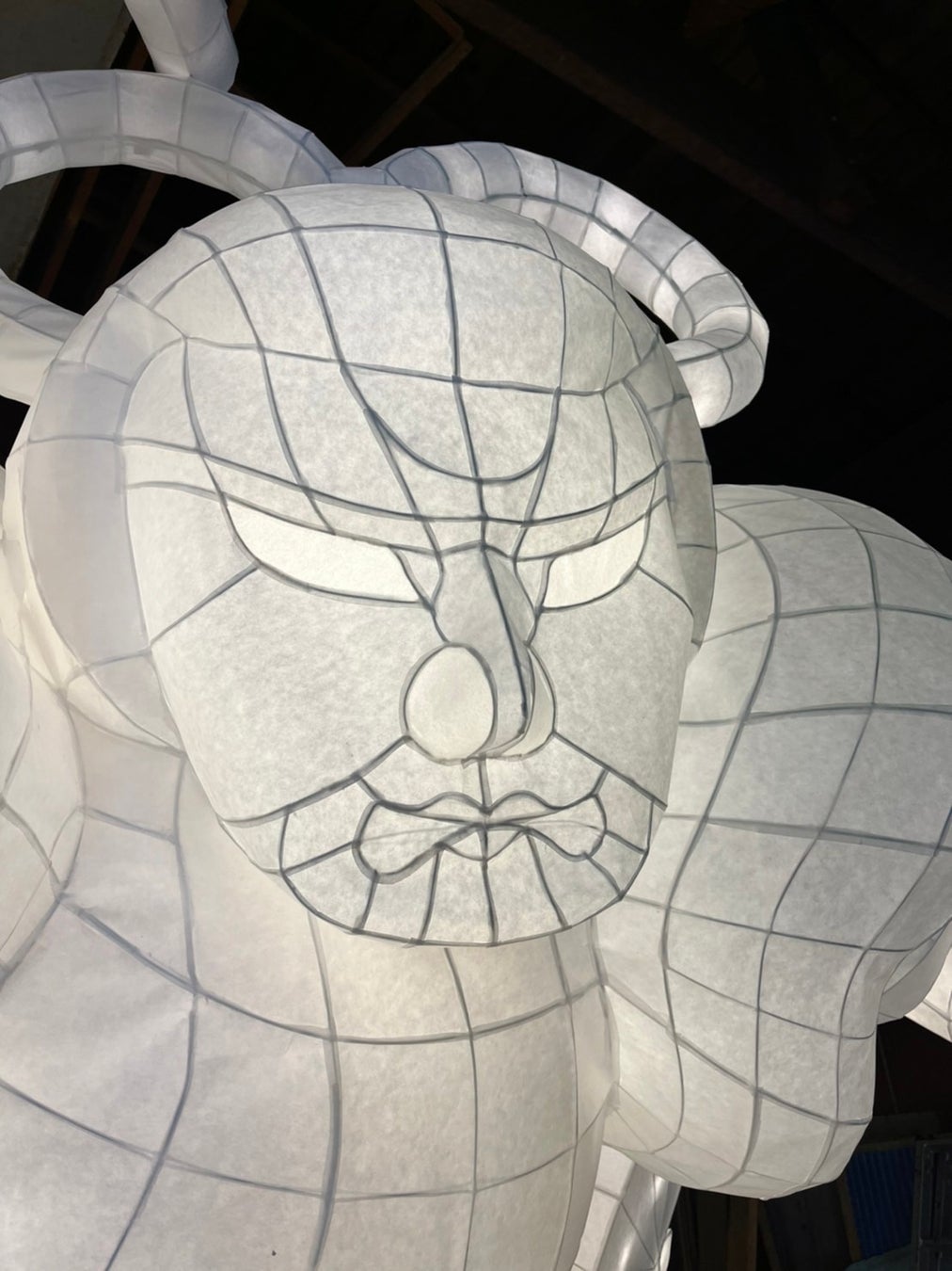 2.祭りに出たねぷたの山車は毎年解体されます。解体後、廃棄されるはずだった和紙の端切れを、針金で作った骨組みに貼り合わせて、立佞武多制作者の福士裕朗さんによってツリーへと進化させます。