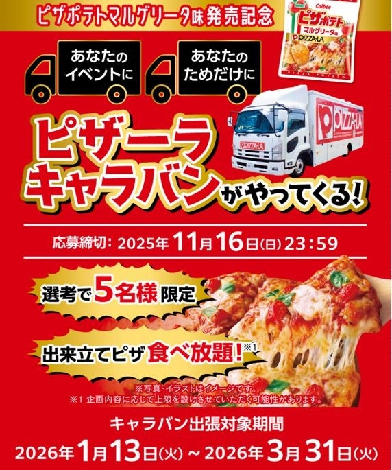 コラボレーション商品の発売を記念して、「ピザーラ」のキッチンカー、「ピザーラキャラバン」を1日貸し切り※1にする権利が当たるキャンペーンを実施します。お客様の大切なイベントなどに、「ピザーラキャラバン」が焼き立てピザをお届けします!おいしい焼き立てピザは食べ放題※2の予定です。ふるってのご応募をお待ちしております。