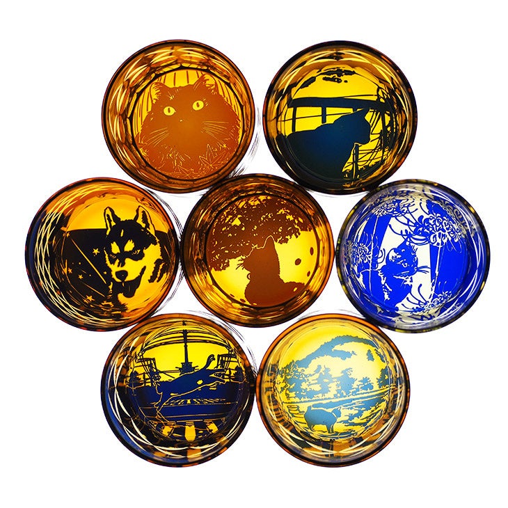 電線と猫と夕焼け。どことなく懐かしいノスタルジックなデザインの猫切子®。飾るだけではなく『使っていただきたい』という思いから側面ではなくあえて底に猫を彫り込んでいます。グラスに注いだ飲み物を呑み干したとき、猫が燦燦と輝きを放ちます。それは使って(呑んで)いただいて初めて見える景色なのです。