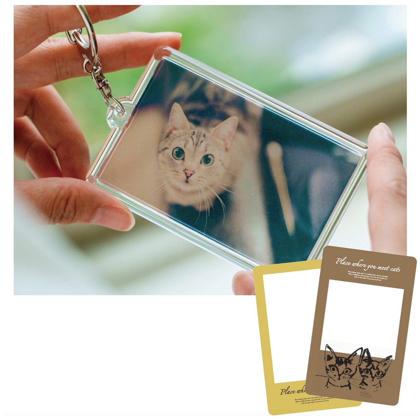 好きな写真でPlace wher you meet catsオリジナルデザインの透明トレカの写真キーホルダーがつくれるワークショップです。サイズは、かわいいチェキサイズ。写真の選び方を専門家がレクチャーしながらその場でプリント後、完成品をすぐお持ち帰りいただけます。