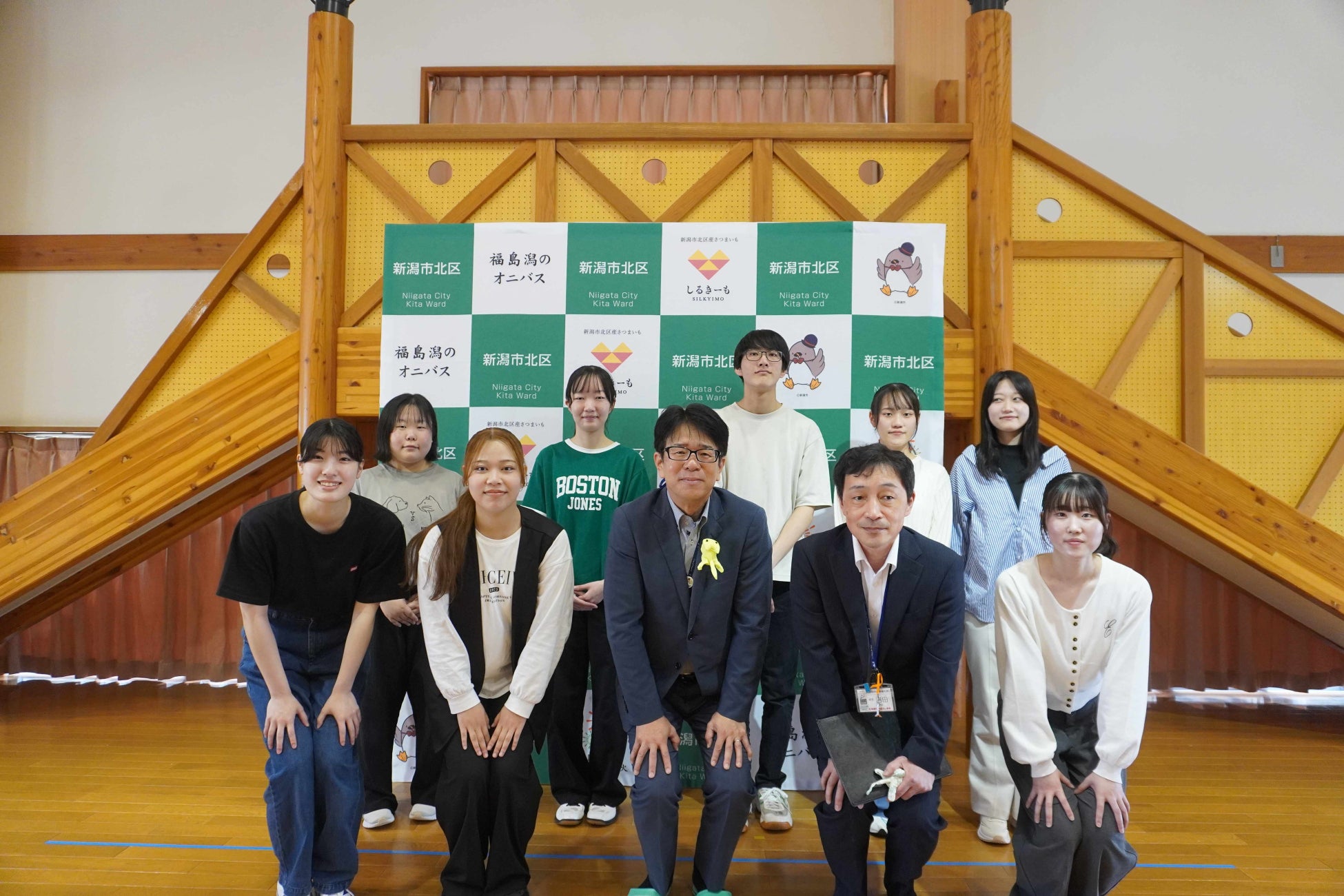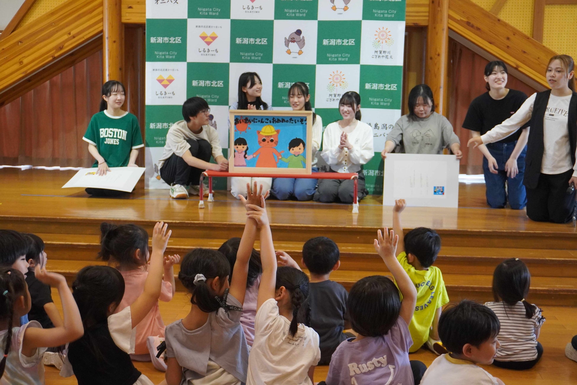 紙芝居の寄贈式がかやま保育園で行われ、丸山寛・新潟市北区長、西原康行・同大学副学長(社会連携担当)、学生などが出席しました。