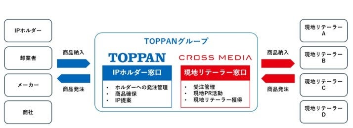 TOPPANとCross Mediaは、これらの課題をふまえ、英国における日本のアニメ・マンガなどのグッズ販売において安全・安心な流通網で適切に現地小売店舗への商品供給を行う卸売販売事業を開始します。日本のIPホルダーとのネットワークを有するTOPPANがIPホルダーとの窓口となり、英国における日本コンテンツの露出や販売の拡大支援に実績のあるCross Mediaが流通を担うことで、効率的な流通網を構築し、日本コンテンツや商品の英国でのプレゼンス向上に貢献します。