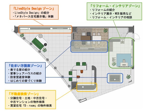 「LiveStyle Shop つくば」では、「住まい方提案ゾーン」・「LiveStyle Designゾーン」・「リフォーム・インテリアゾーン」・「不動産検索ゾーン」の4つのエリアを設け、住まいに関する様々な視点からお客さまの悩みやお困りごとに応える多様なコンテンツを用意しました。