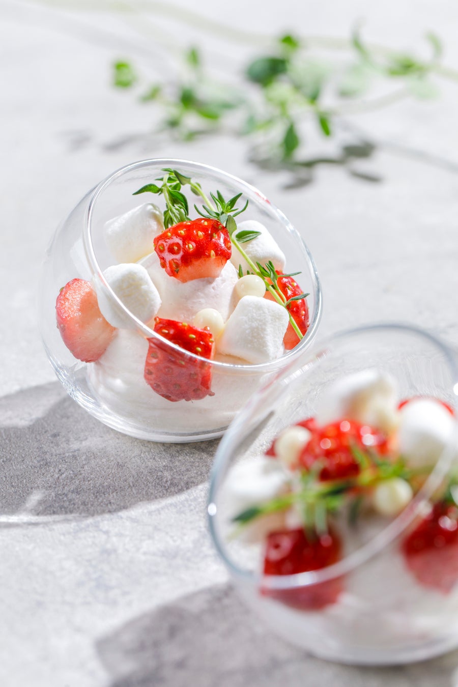 軽やかで初夏にふさわしい味わいのイートンメスは、ストロベリーとマスカルポーネクリーム、マシュマロを合わせてタイムをトッピング。食感もお楽しみください。