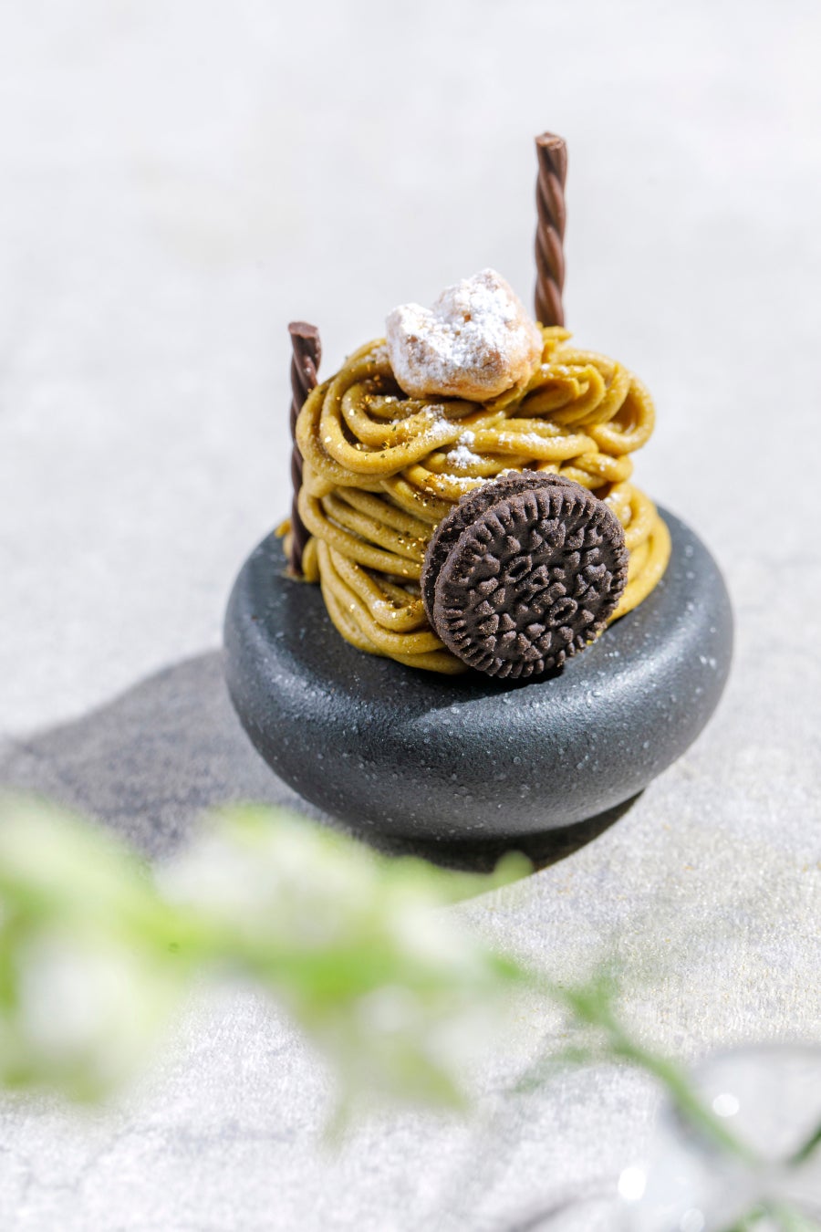 チョコレートクリームにピスタチオの風味豊かなモンブランクリームを絞りました。濃厚なコクと香ばしさを贅沢に感じていただけます。