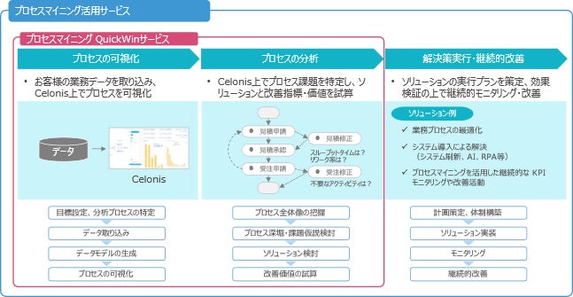このたび、「プロセスマイニング活用サービス」の中で提供するサービスの第一弾として、プロセスマイニングツールの利用とコンサルティングサービスを組み合わせた「プロセスマイニングQuickWinサービス」を提供開始します。
