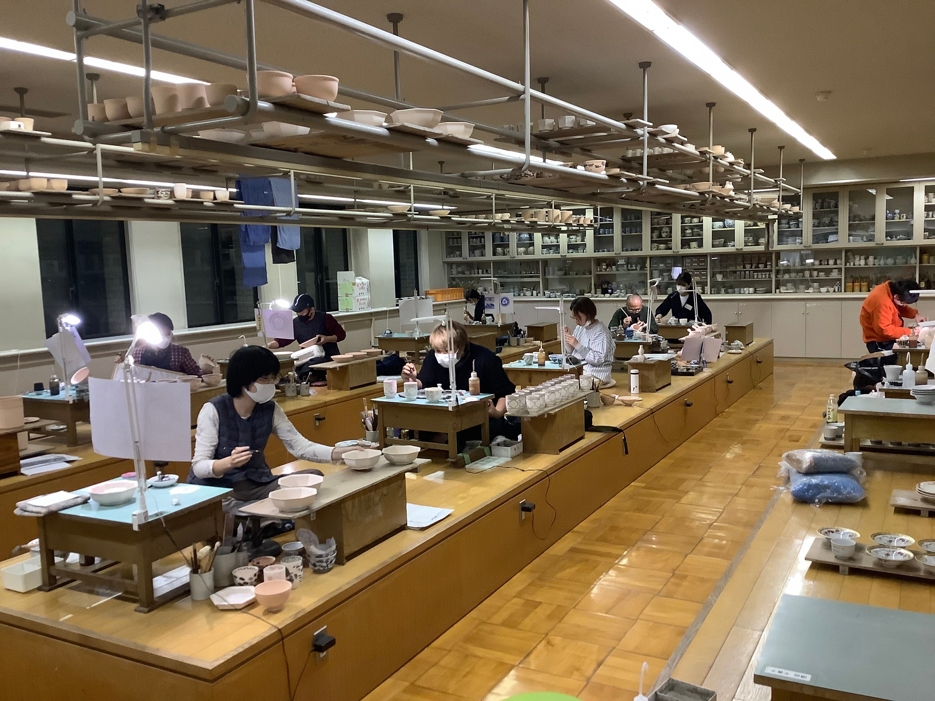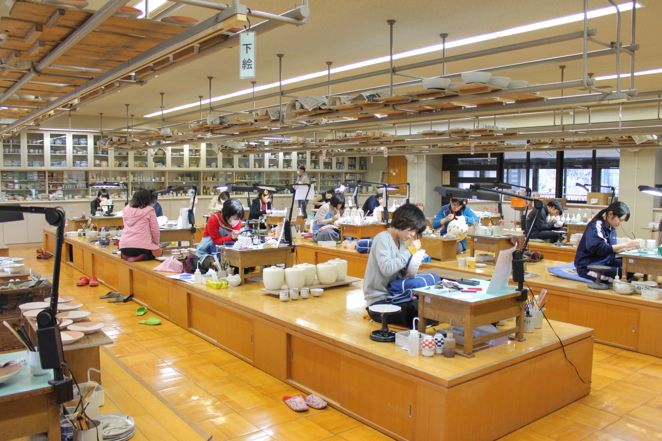 ロクロ成形を主とする「やきもの成形科」、陶磁器に絵付をする「絵付デザイン科」があり、作陶技法はともに手づくり・手描きにこだわっており、現在も約60名の訓練生が日々訓練に励んでいます。