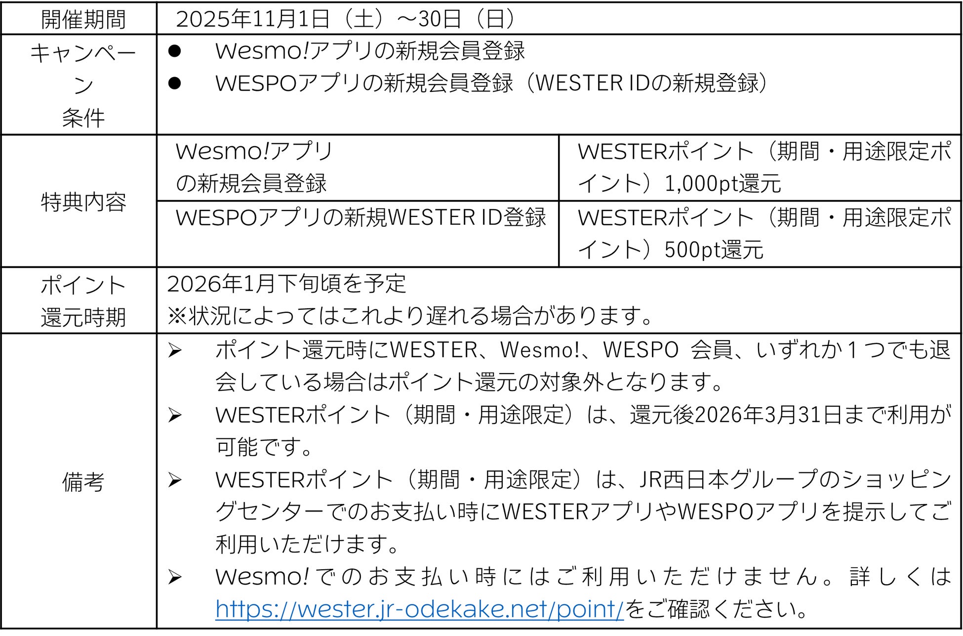 詳しくは https://wester.jr-odekake.net/point/ をご確認ください。