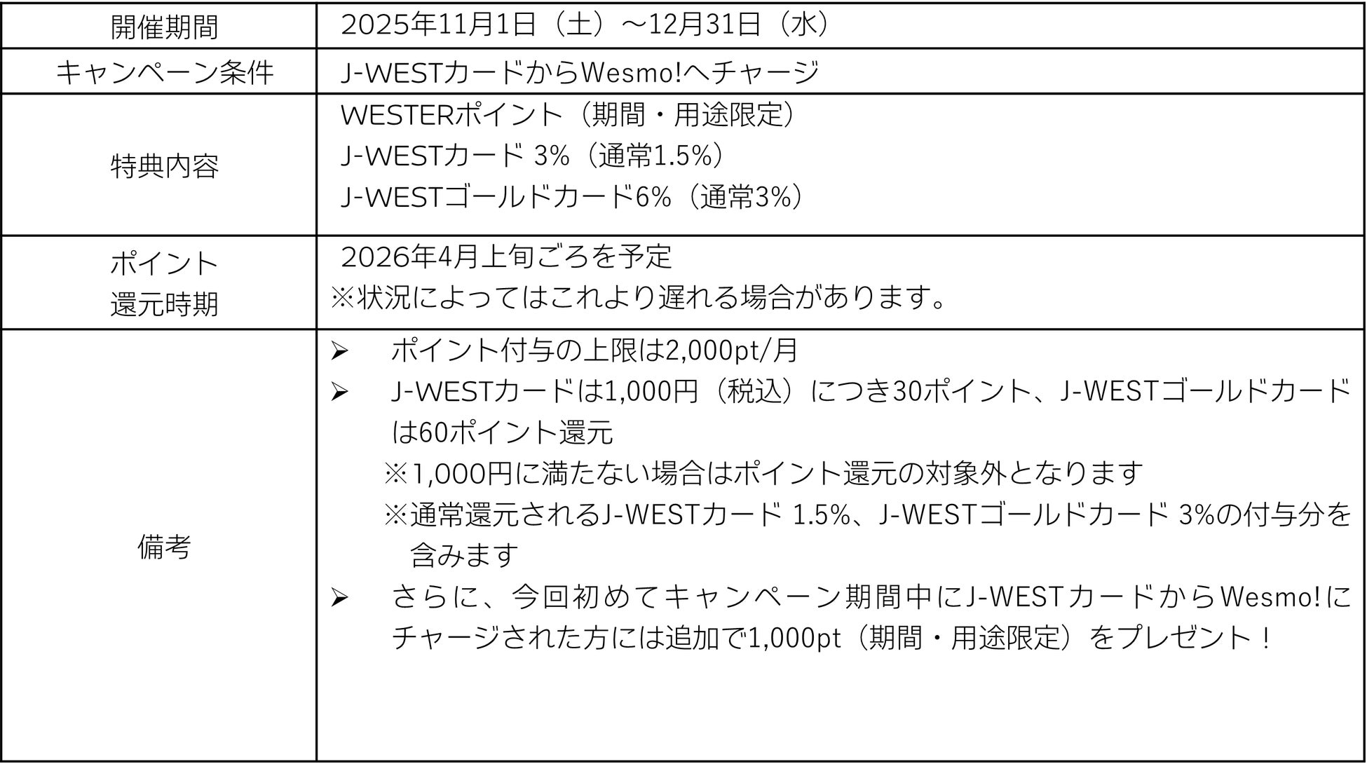 11月1日~12月31日までの期間、J-WESTカードからWesmo!へチャージするといつもの2倍の WESTERポイントが還元されるキャンペーンを実施します。