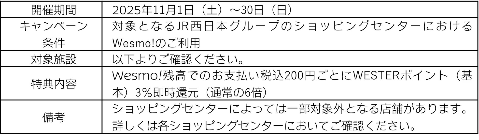 また、既にWesmo!の会員登録いただいている方にもおトクにWESTERポイントがたまるキャンペーンとして、JR西日本グループのショッピングセンター(約8,000店舗)で期間中にWesmo!残高によりお支払いいただくと、WESTERポイント(基本)を3%(通常の6倍)即時還元します。