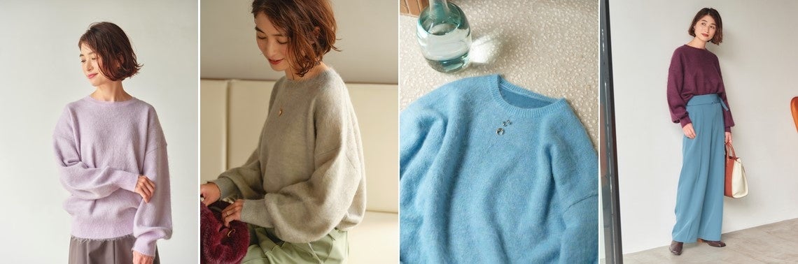 ニットは着心地にこだわり、高品質と軽さを併せ持つモヘア糸をベースに、チクチクを軽減する編み方を施し、裏面には肌触りの良いストレート糸を使用しました。わかめさんの豊富なスタイリング経験を活かしたカラー展開で、手持ちのボトムに合わせるだけで今年っぽくなる挿し色や、着回し力のあるニュアンスカラーで華やかさを演出します。