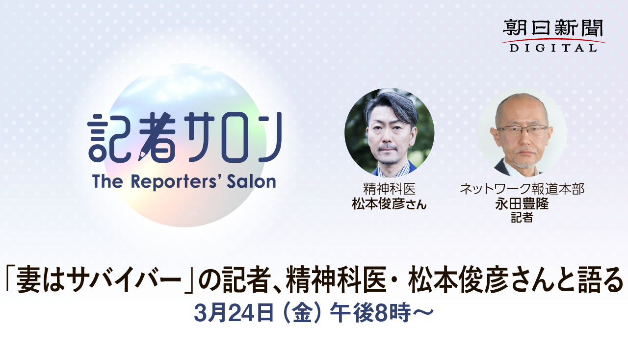 『妻はサバイバー』は、朝日新聞ネットワーク報道本部記者で、貧困ジャーナリズム賞を受賞したこともある永田豊隆さんが、精神疾患を抱えた妻との20年にわたる壮絶な日々を綴った迫真のルポルタージュです。本作は、2018年に朝日新聞デジタルで連載され、100万PVを超えるなど、大きな反響を呼びました。その後、2022年4月に書籍化されると、Yahoo!ニュース|本屋大賞「2022年ノンフィクション本大賞」にノミネート。受賞こそ逃しましたが、各界で話題となりました。その永田さんと、国立研究開発法人国立精神・神経医療研究センター精神保健研究所薬物依存研究部長・薬物依存症センター長の松本俊彦さんが今年3月末、朝日新聞東京本社で開かれたオンラインイベントで顔を合わせて語り合いました。視聴者の皆さんから「お二人のお話に非常に説得力がありました」「涙が止まりませんでした」など熱い感想が続々と届いています。