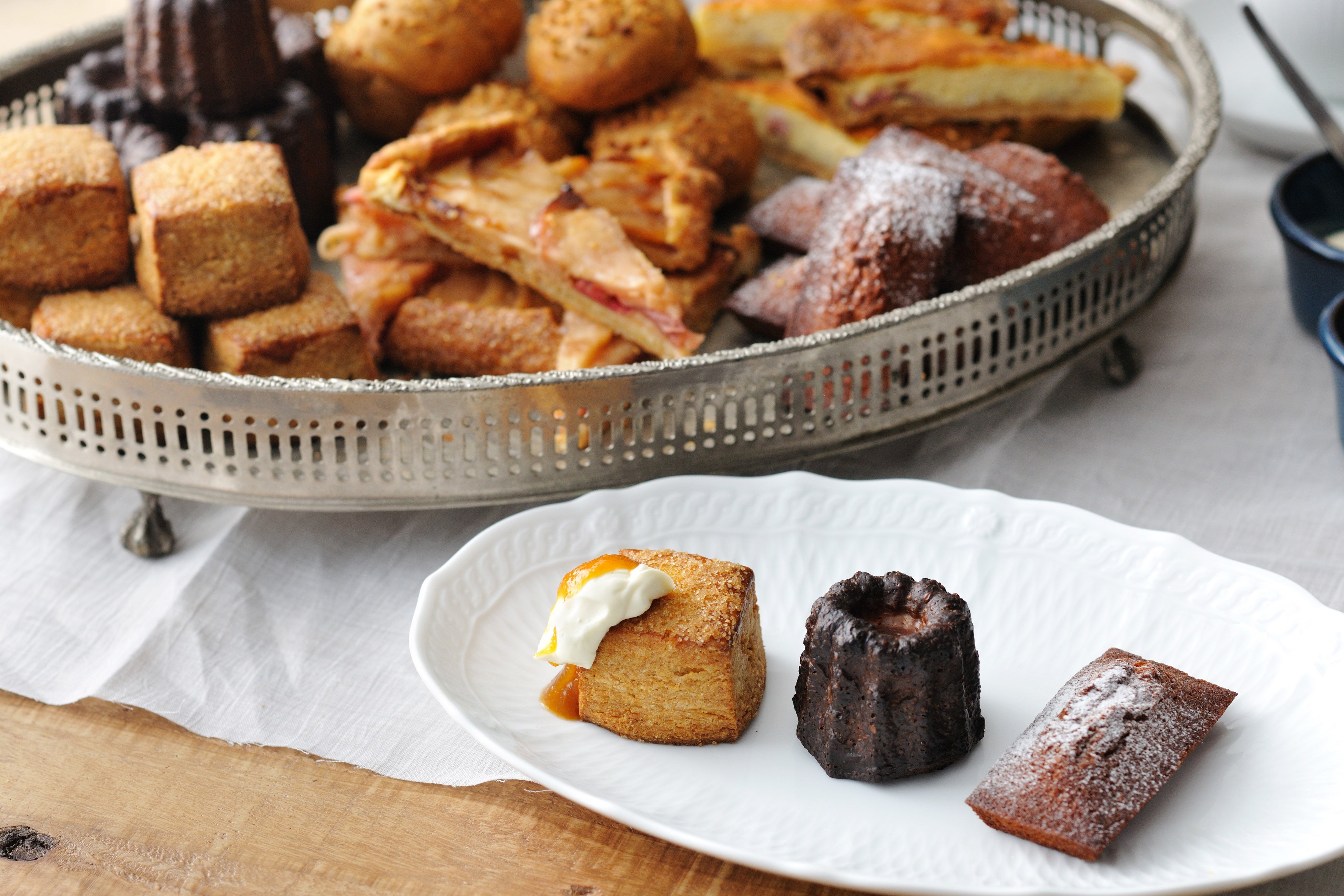 がりっとした食感や焦がしバターの香りが楽しめる、店舗仕込みのフィナンシェ、カソナードを使ったこんがりと香ばしい全粒粉のスコーン、外はカリカリで中はもっちりなカヌレなど、主役のベイクが並びます。