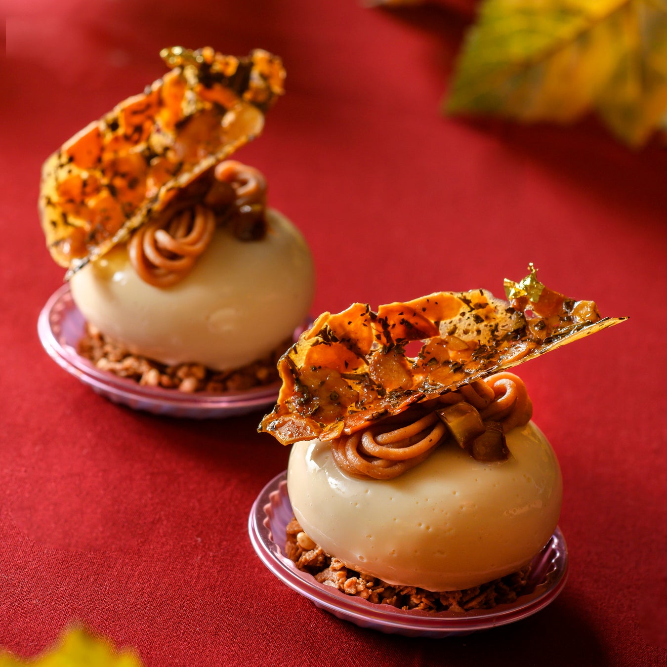 ほうじ茶と栗を使った和スイーツ。中にタイベリーのソースを入れてアクセントにしています。