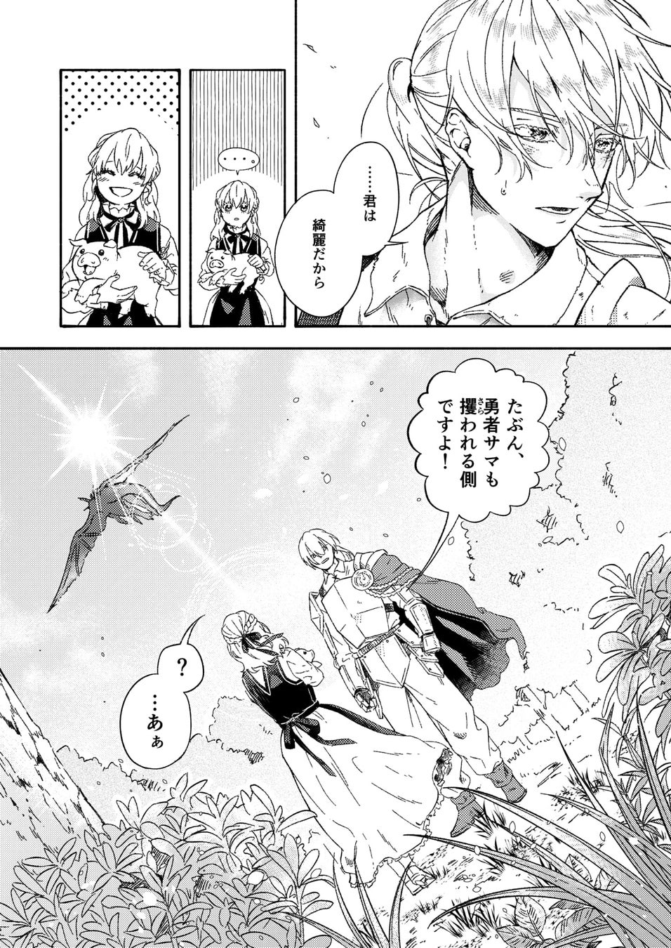 美しく丁寧さを感じる作画と、躍動感のあるアクションシーンが目を引く作品でした。表情豊かなキャラクターたちも魅力的です! ラストの勇者サマの照れ顔も素敵でした。