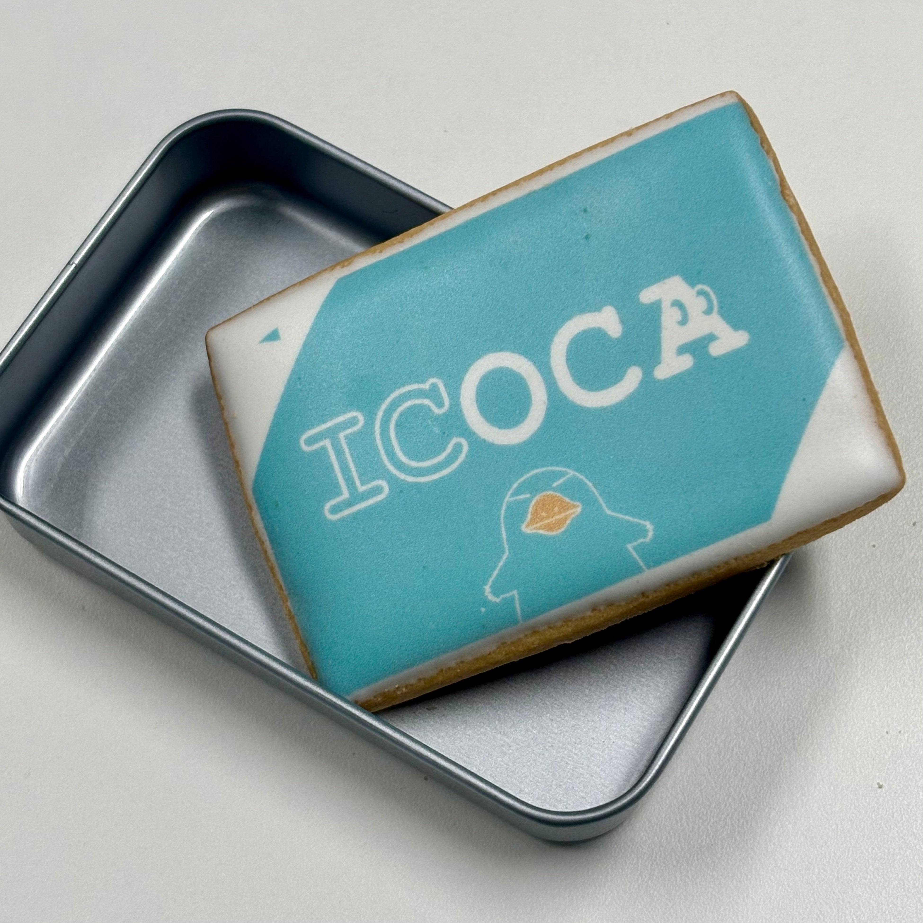 JR西日本ICカード「ICOCA」のデザインが全体にあしらわれたクッキー缶です。
