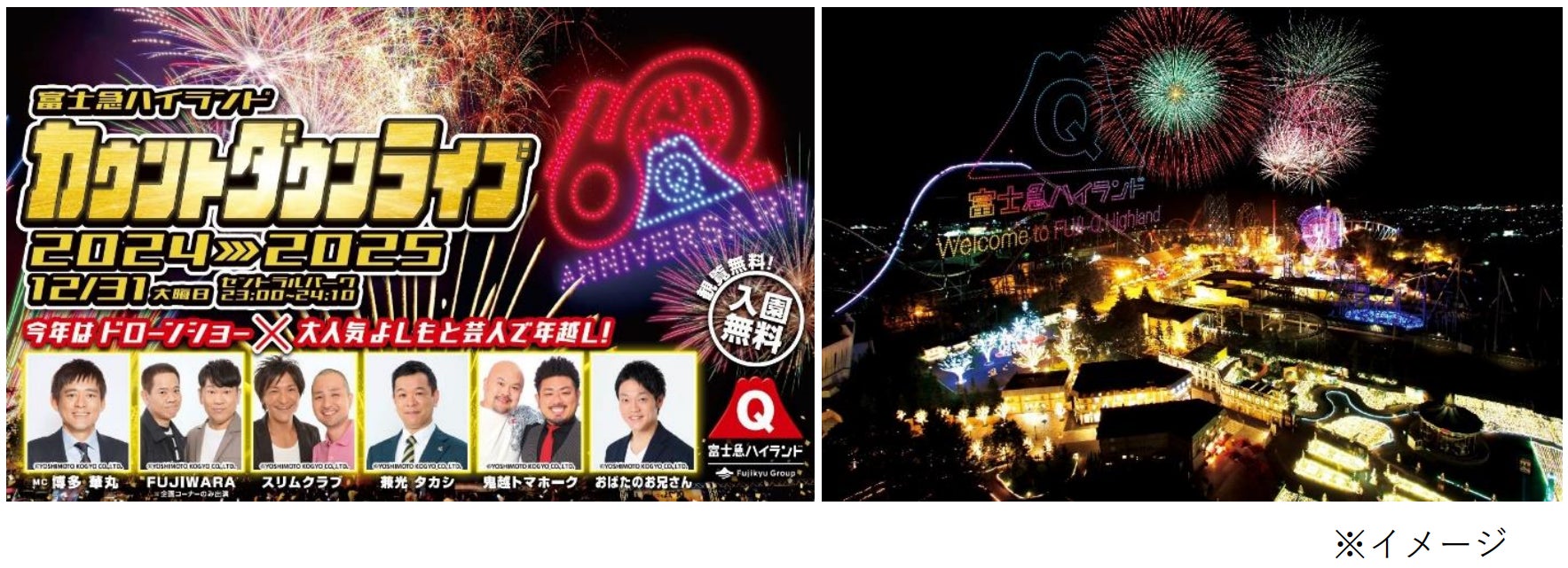 大晦日の23時より開催する「富士急ハイランドカウントダウンライブ2024-2025」では、イベントMCとして「博多華丸」が登場。さらに、「FUJIWARA」(企画コーナーのみ)、「スリムクラブ」、「鬼越トマホーク」、「兼光タカシ」、「おばたのお兄さん」ら人気実力派芸人が次々に登場し、会場に爆笑の渦を巻き起こします。爆笑ステージとドローン&花火ショーで、2025年の幕開けを明るく華やかに彩ります。