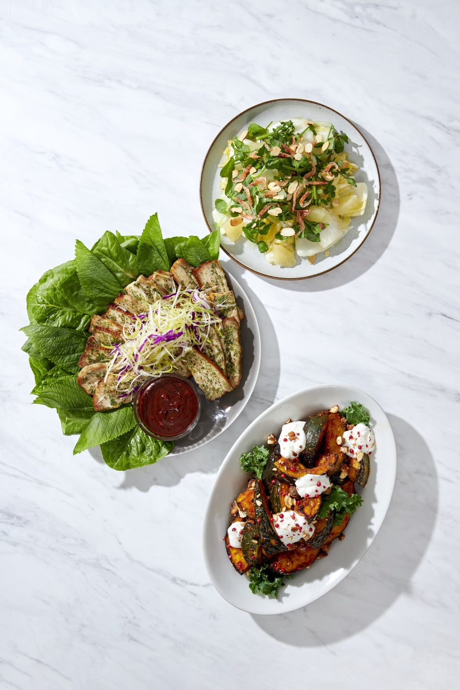 歯触りの良いロメインレタスと独特な清涼感のあるエゴマの葉で包んで、自家製の辛味噌“サムジャン”をつけてお召し上がりいただきます。