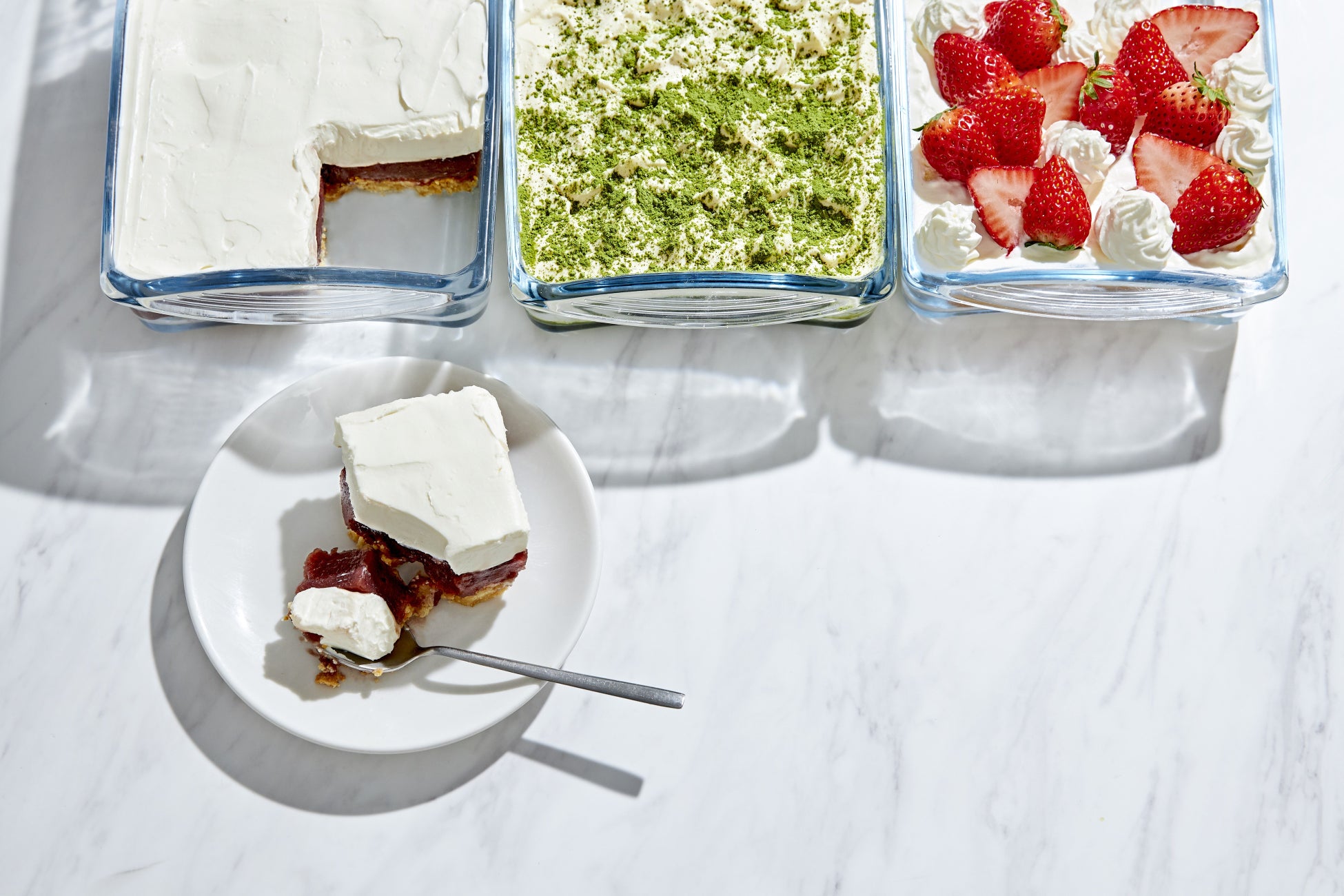 いちごのムースショートケーキ、あんことブリーチーズのケーキ、抹茶とホワイトチョコレートのティラミスの中からお好みの2種類をお選びください。