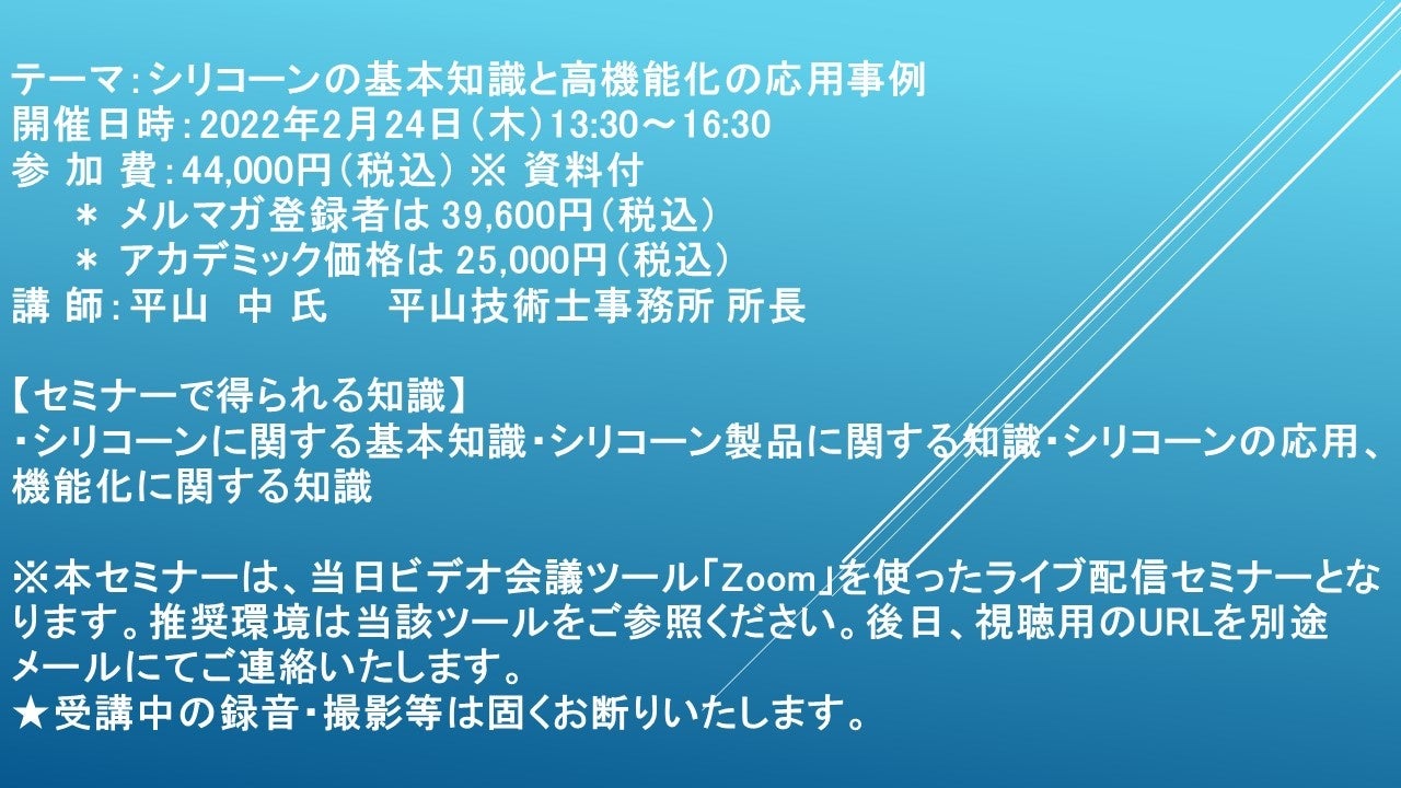 先端技術情報や市場情報を提供している(株)シーエムシー・リサーチ(千代田区神田錦町: https://cmcre.com/ )では、 各種材料・化学品などの市場動向・技術動向のセミナーや書籍発行を行っておりますが、 このたび「シリコーンの基本知識と高機能化の応用事例」と題するセミナーを、 講師に平山 中 氏 平山技術士事務所 所長)をお迎えし、2022年2月24日(木)13:30より、 ZOOMを利用したライブ配信で開催いたします。 受講料は、 一般:44,000円(税込)、 弊社メルマガ会員:39,600円(税込)、 アカデミック価格は25,000円(税込)となっております(資料付)。