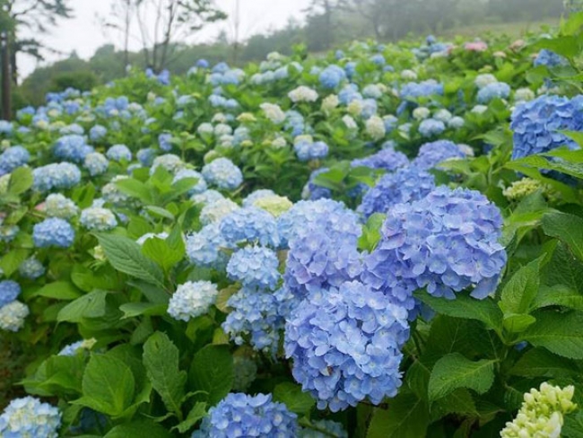 標高850mに位置する六甲山カンツリーハウスは、神戸の市街地に比べ年間の平均気温が5~6℃低いため、1ヶ月ほど遅く見ごろを迎えます。六甲山は酸性土壌のため、澄んだ青色が美しい特有のアジサイが主に楽しめます。園内には西洋アジサイ、ガクアジサイ、日本アジサイなど約2500株を植栽しており、群落が見事です。