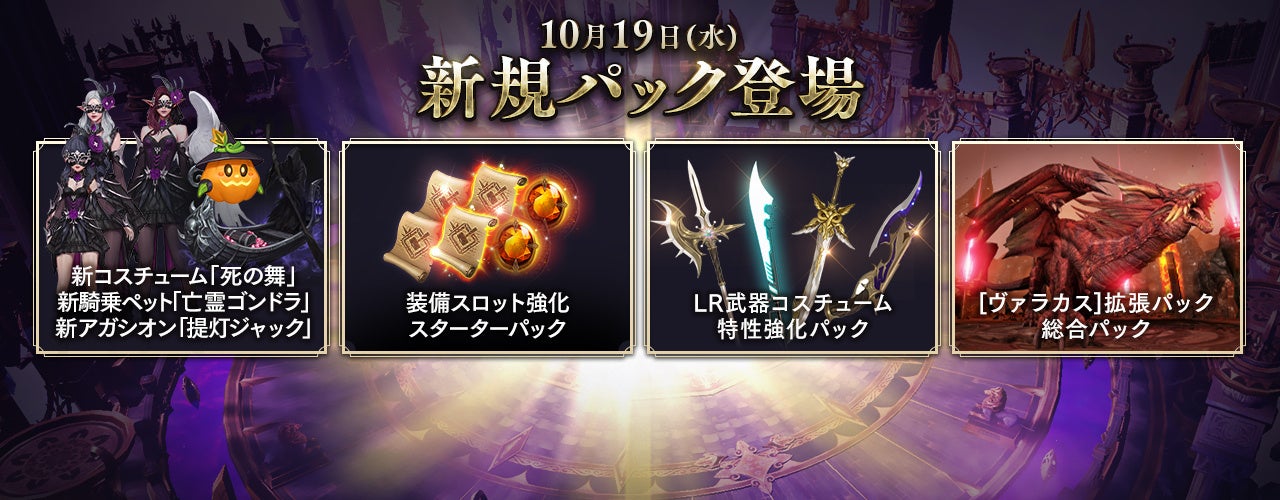 ハロウィンを記念した新コスチューム「死の舞」や新騎乗ペット「亡霊ゴンドラ」、ジャック・オー・ランタンの顔をした新アガシオン「堤灯ジャック」が登場しております。いずれもショップより手に入れることができます。ぜひ『リネレボ』世界のハロウィンを満喫してください!