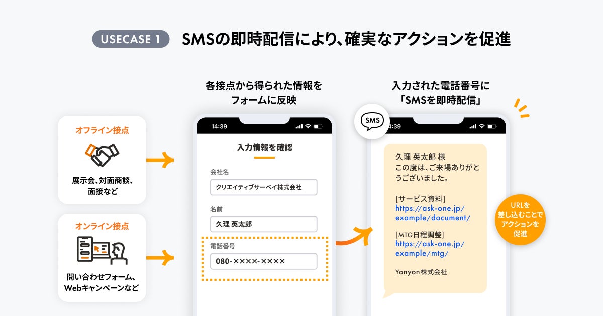 「CPaaS NOW」のSMS・メール送信機能により、「Ask One」および「Fan Fan Fan」で生成したフォームから得られた顧客データ(AI OCRで読み取った名刺情報やフォーム入力情報)に基づき、リアルタイムでのお礼メッセージ送信が可能。