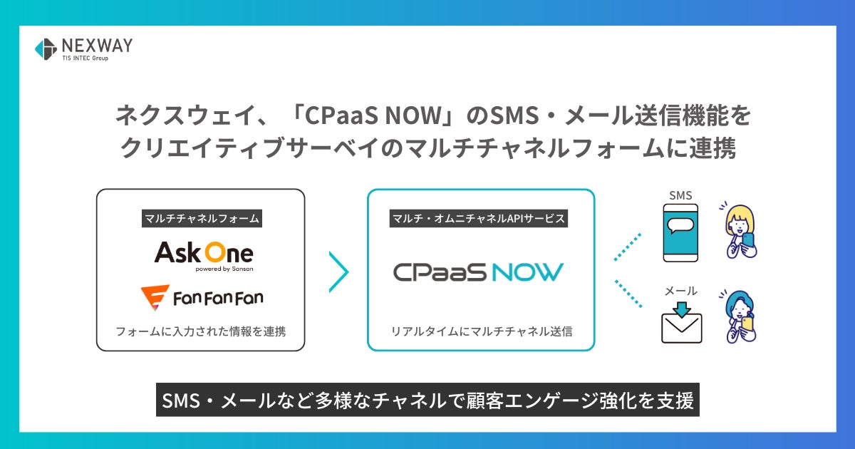 TISインテックグループの株式会社ネクスウェイ(本社:東京都江東区、代表取締役社長:松森正彦、以下:ネクスウェイ)は、マルチ・オムニチャネル※1APIサービス「CPaaS NOW」のSMS・メール送信機能が、クリエイティブサーベイ株式会社(本社:東京都港区、代表取締役:石野真吾、以下:クリエイティブサーベイ)が提供する、マルチチャネルフォーム「Ask One」および「Fan Fan Fan」と連携したことを発表します。