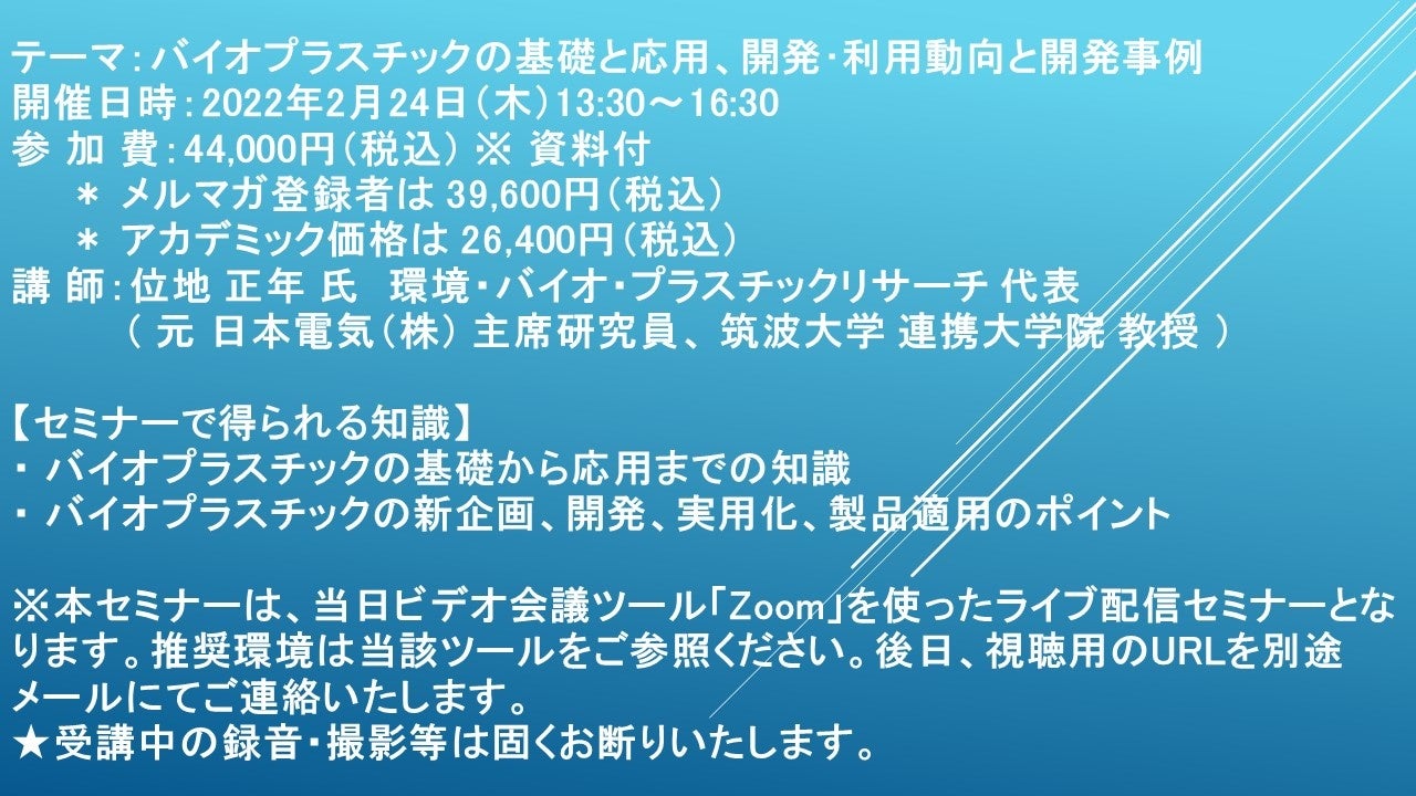 先端技術情報や市場情報を提供している(株)シーエムシー・リサーチ(千代田区神田錦町: https://cmcre.com/ )では、 各種材料・化学品などの市場動向・技術動向のセミナーや書籍発行を行っておりますが、 このたび「バイオプラスチックの基礎と応用、開発・利用動向と開発事例」と題するセミナーを、 講師に位地 正年 氏 環境・バイオ・プラスチックリサーチ 代表( 元 日本電気(株) 主席研究員、 筑波大学 連携大学院 教授 ))をお迎えし、2022年2月24日(木)13:30より、 ZOOMを利用したライブ配信で開催いたします。 受講料は、 一般:44,000円(税込)、 弊社メルマガ会員:39,600円(税込)、 アカデミック価格は26,400円(税込)となっております(資料付)。