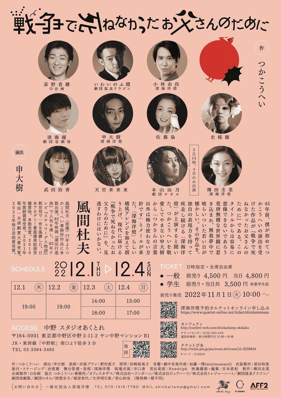 深海洋燈×O企画『戦争で死ねなかったお父さんのために』が2022年12月1日 (木) ~2022年12月4日 (日)に中野スタジオあくとれ(東京都中野区中野2-11-2サン中野マンションB1)にて上演されます。