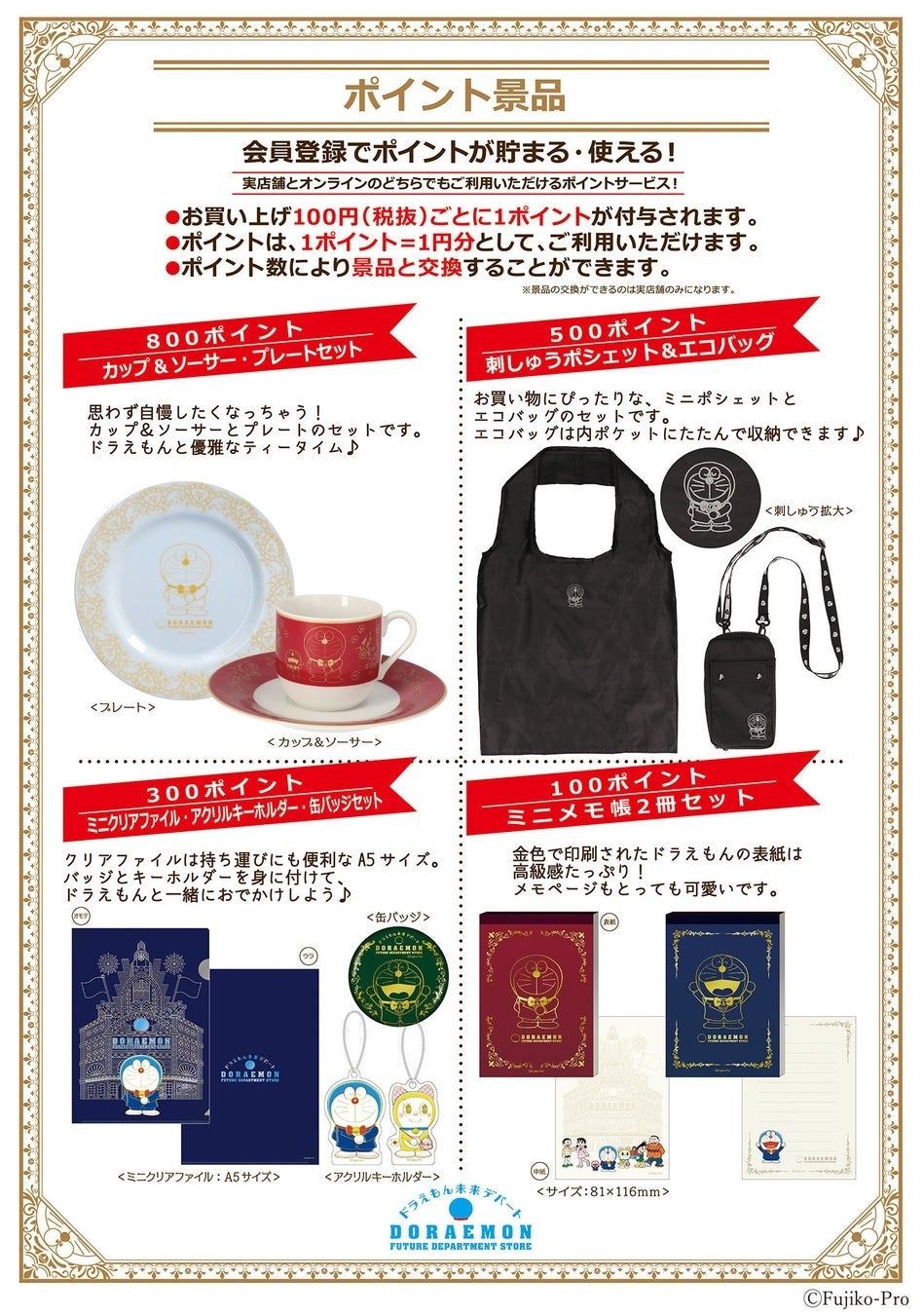 お買い物ごとにポイントを貯めていただくことで、1ポイント=1円の割引、もしくは「ドラえもん未来デパート」限定の景品(非売品)と交換することができます。ご購入の商品価格100円(税抜)ごとに、1ポイントを付与いたします。お客さまのお誕生月はポイント2倍!
